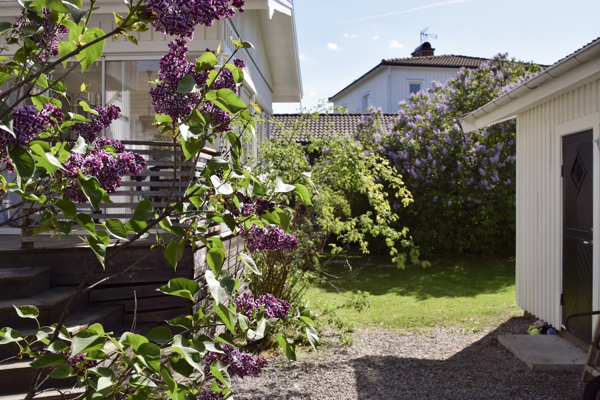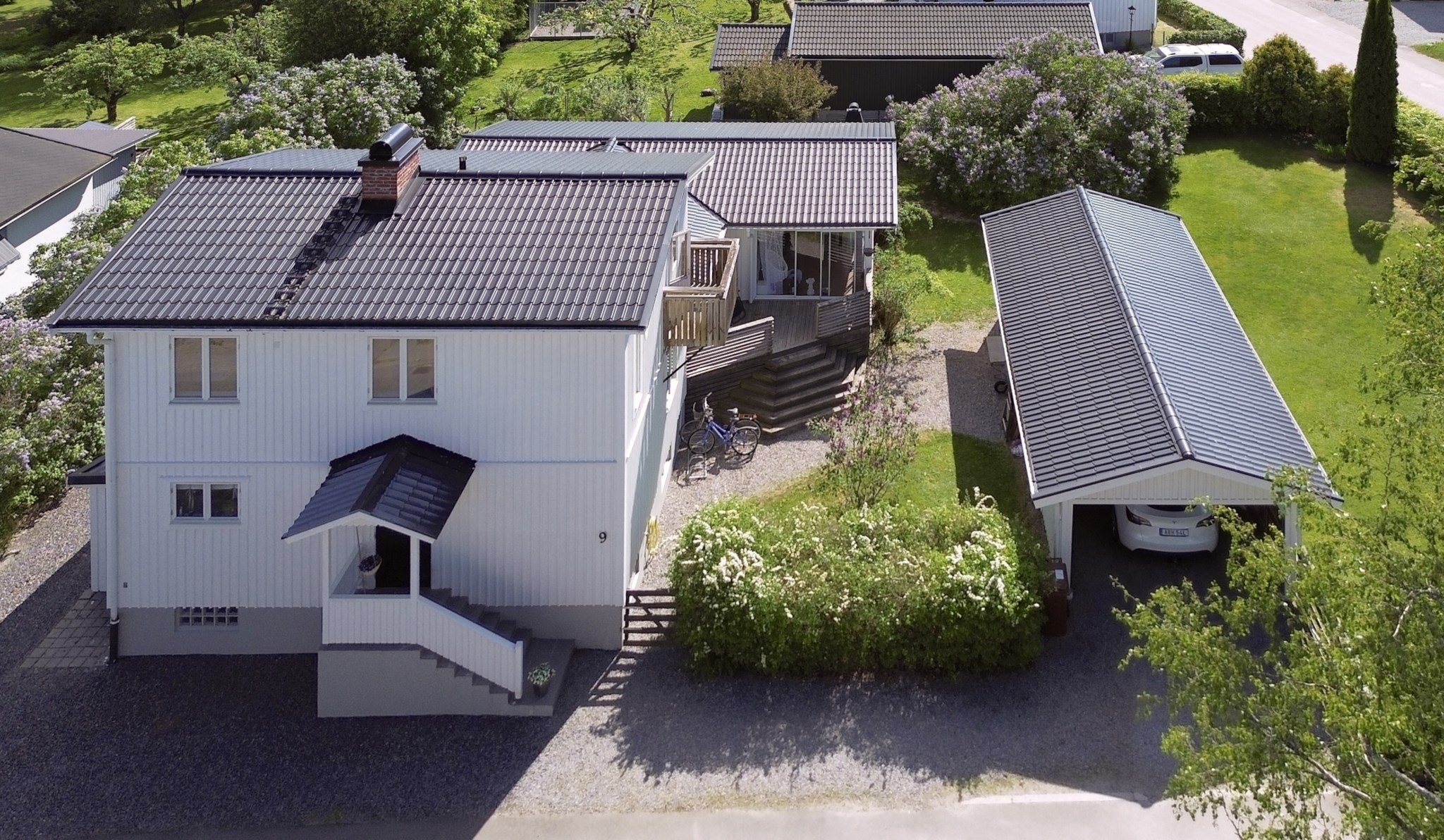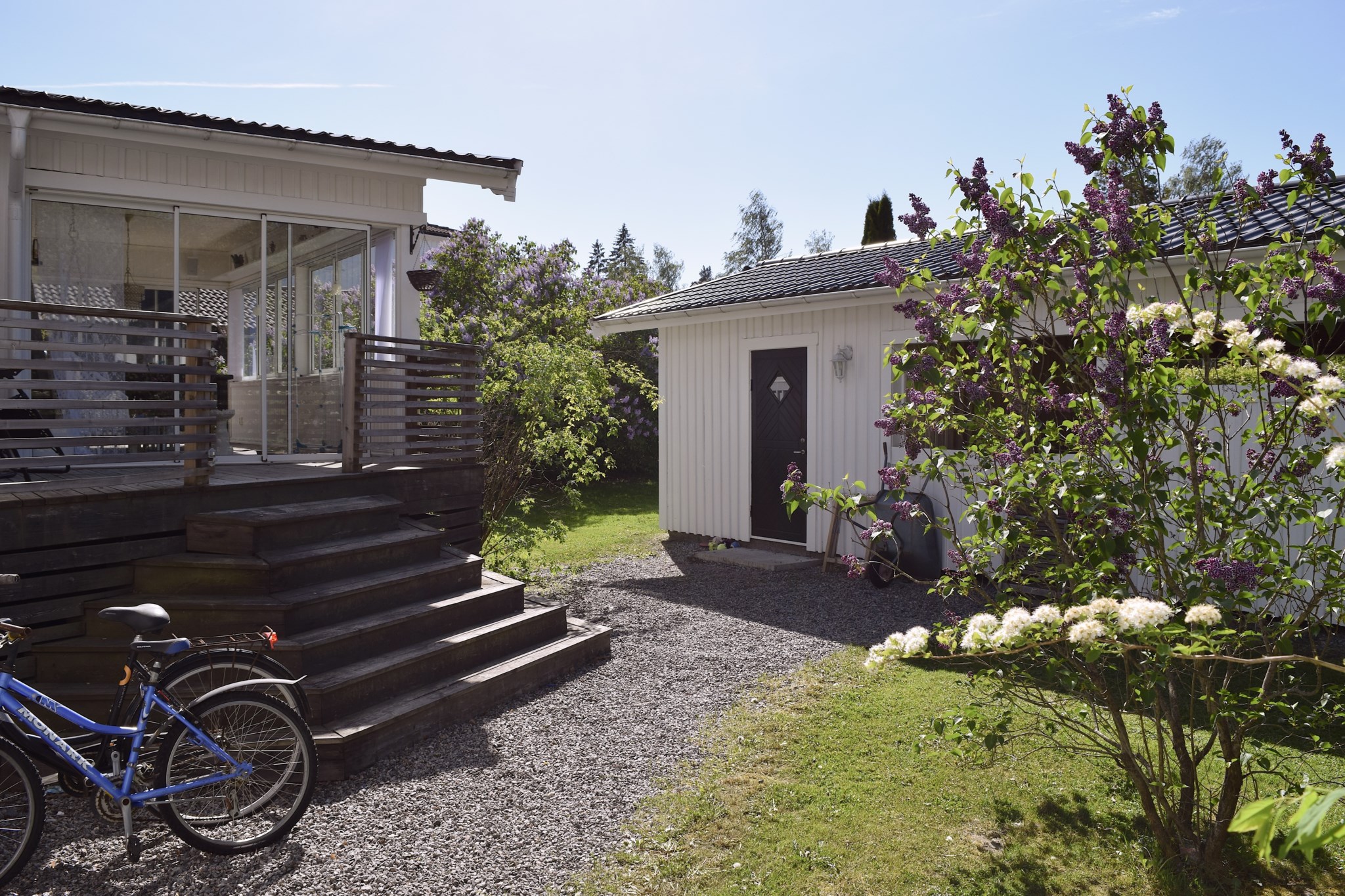 Trädgården är en grön oas med plats för både lekande barn och lata sommarkvällar. Här finns även carport och förråd med plats för redskap och verktyg.