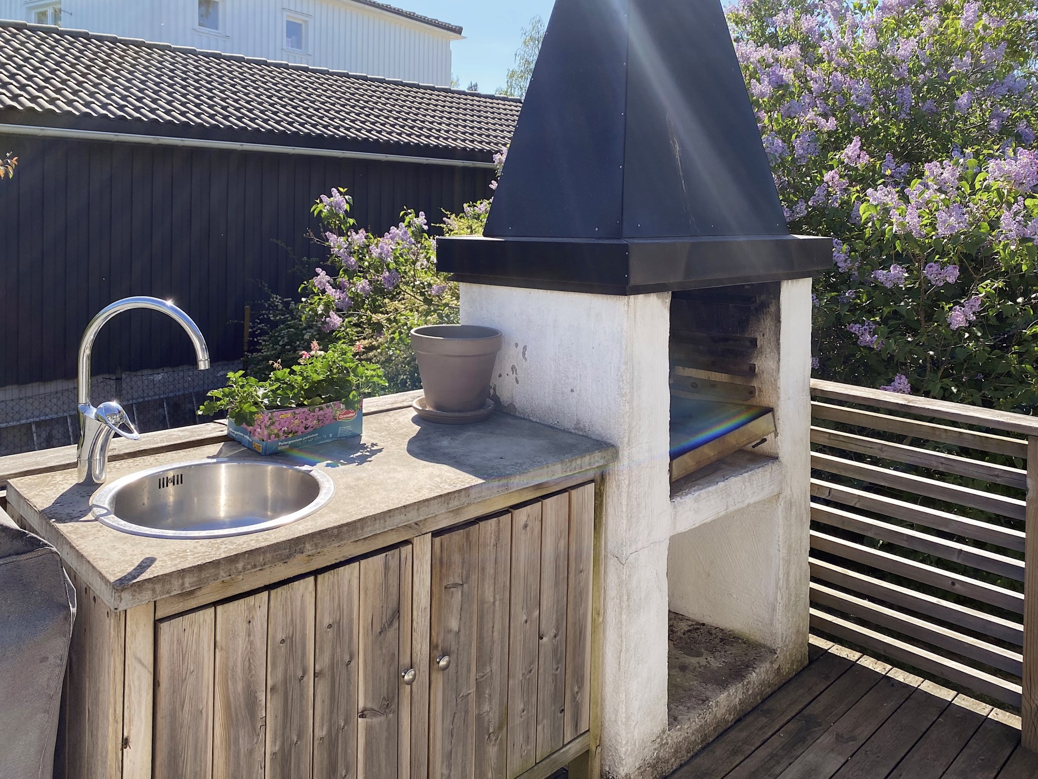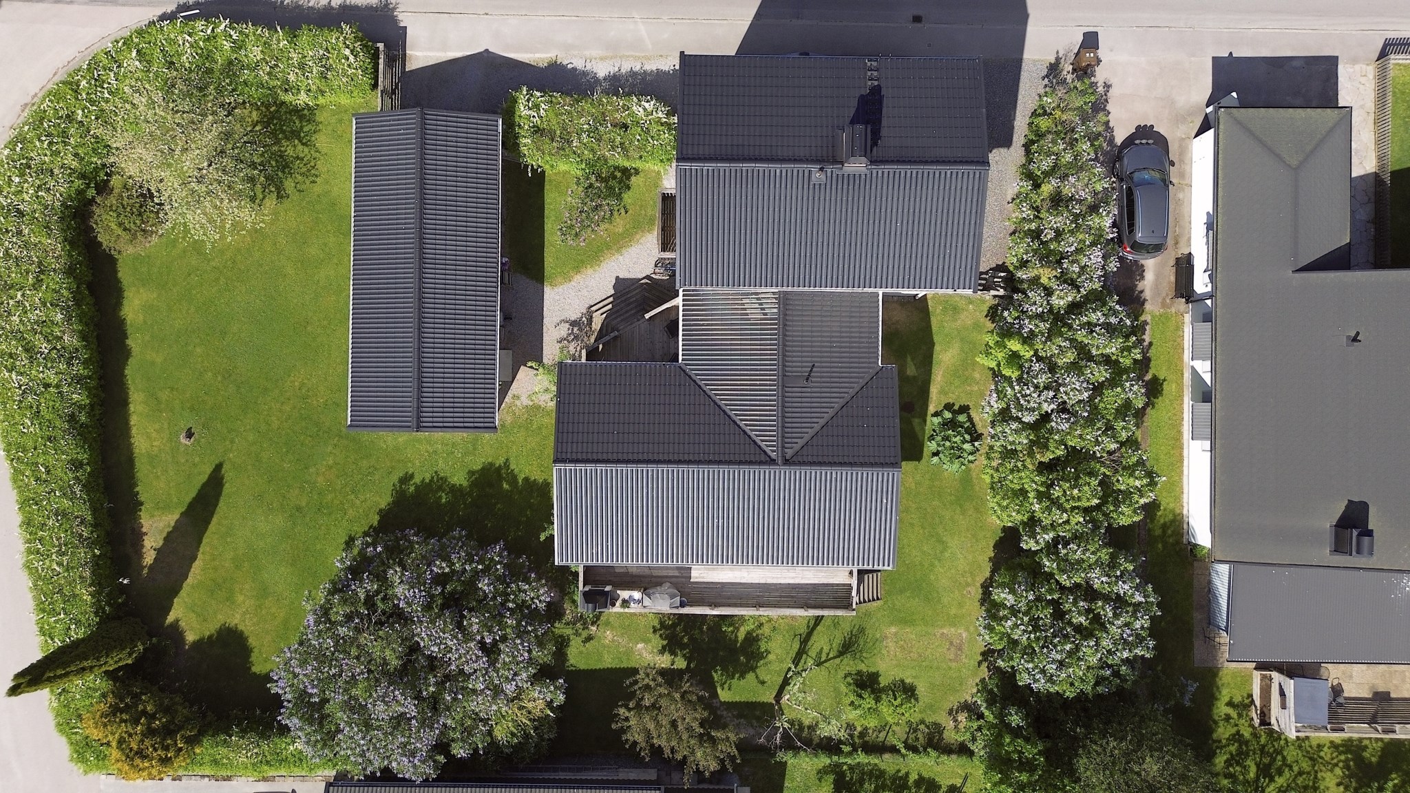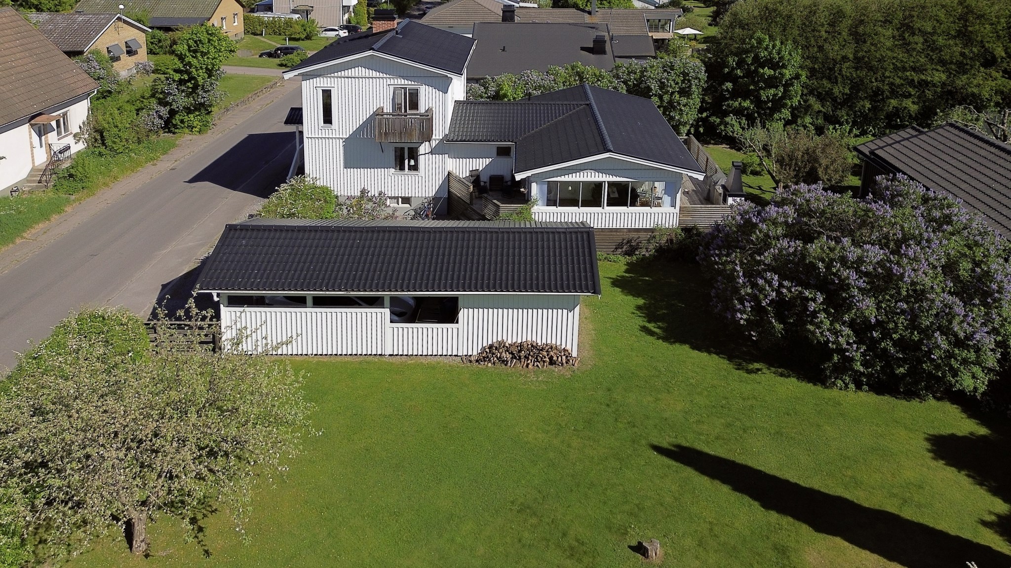 Trädgården är en grön oas med plats för både lekande barn och lata sommarkvällar. Här finns även carport och förråd med plats för redskap och verktyg.
