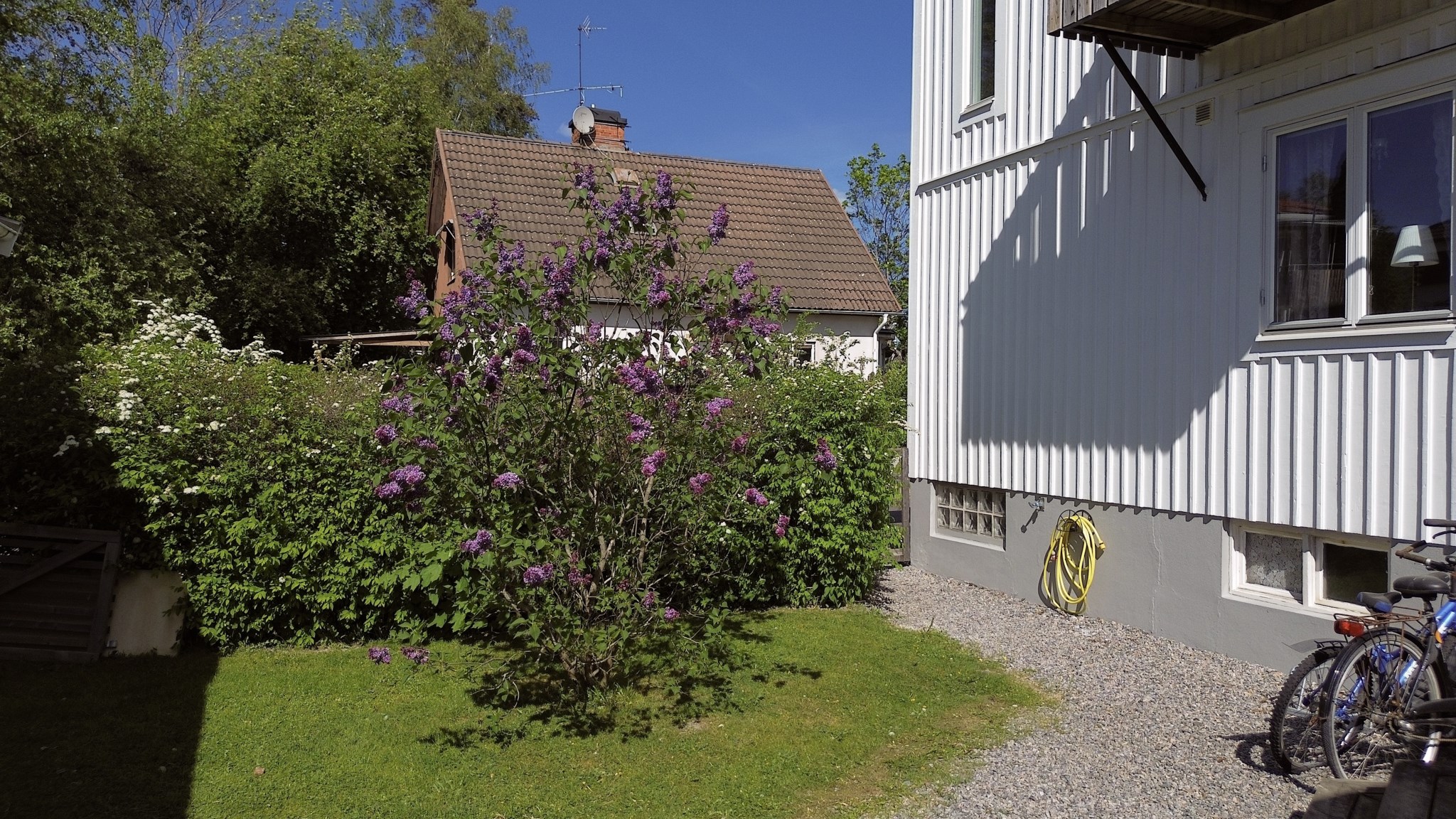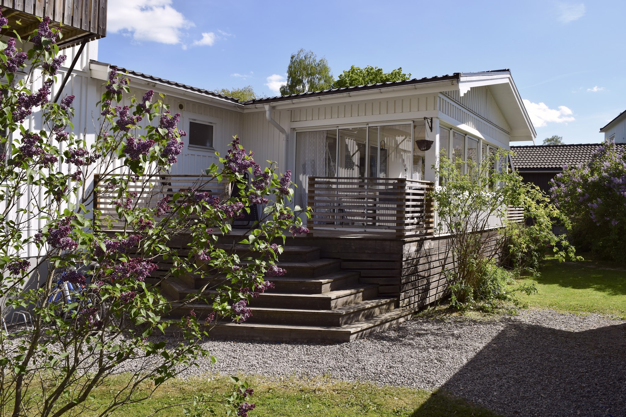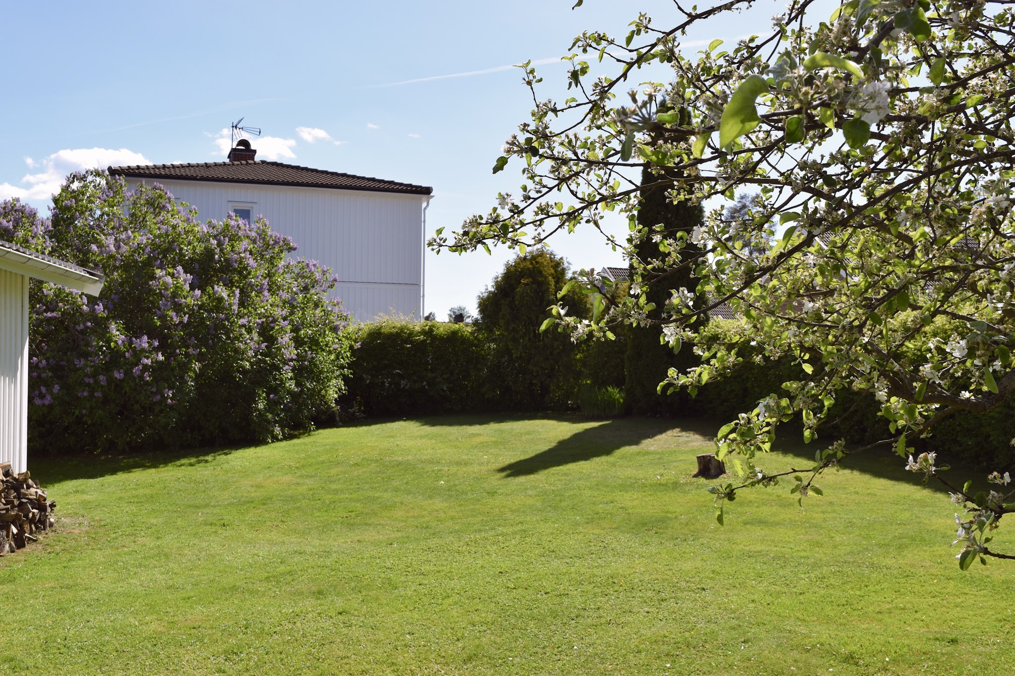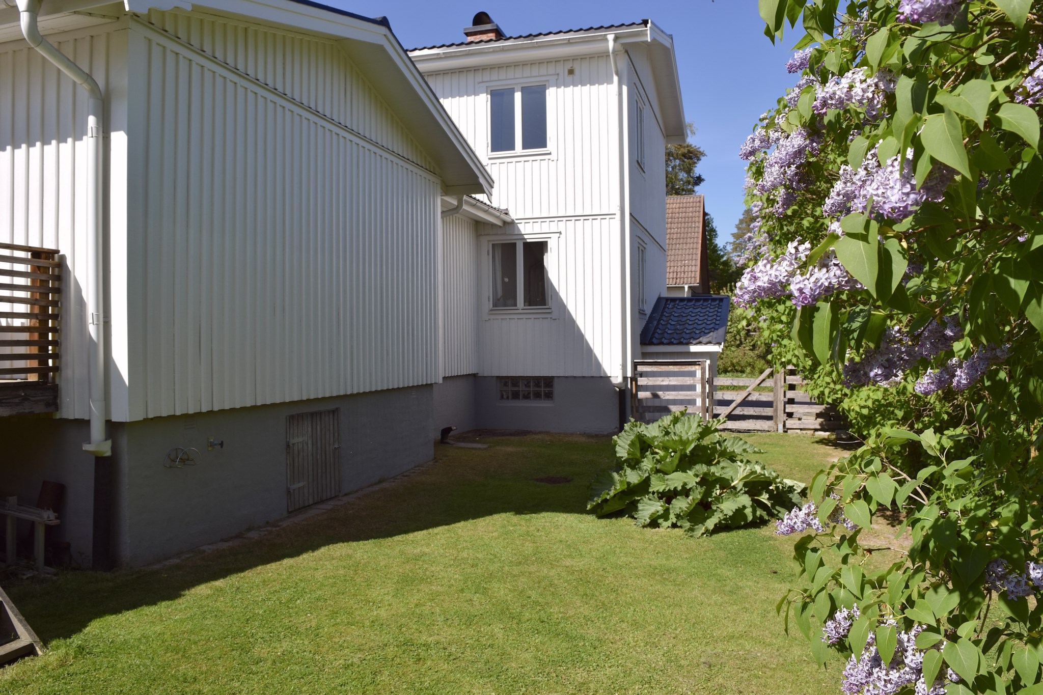 Villan är vackert placerad på en solig hörntomt, omgiven av grönska och en trädgård som lockar till både lek, vila och trädgårdsdrömmar. Den vita fasaden tillsammans med den välskötta tomten ger ett varmt och välkomnande första intryck.