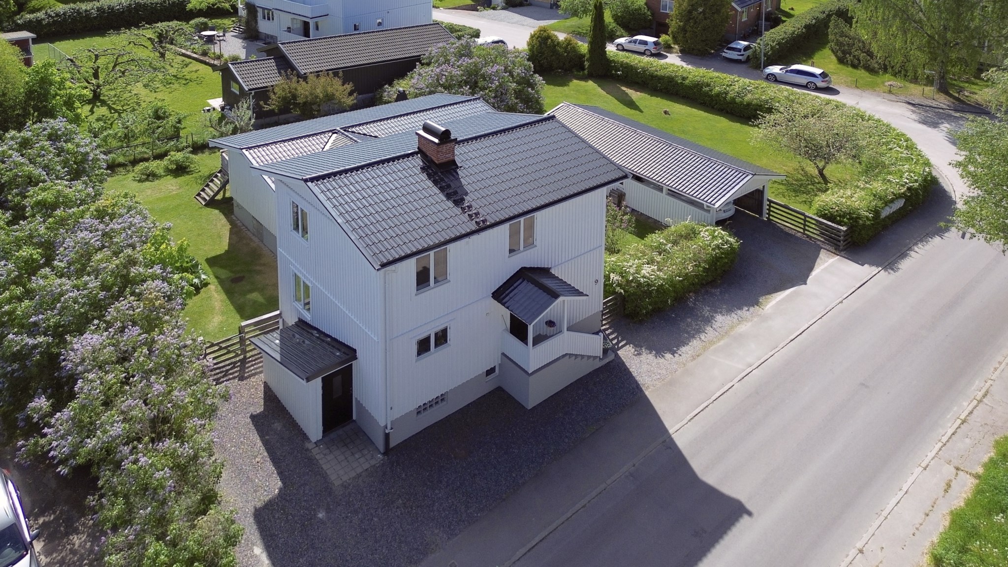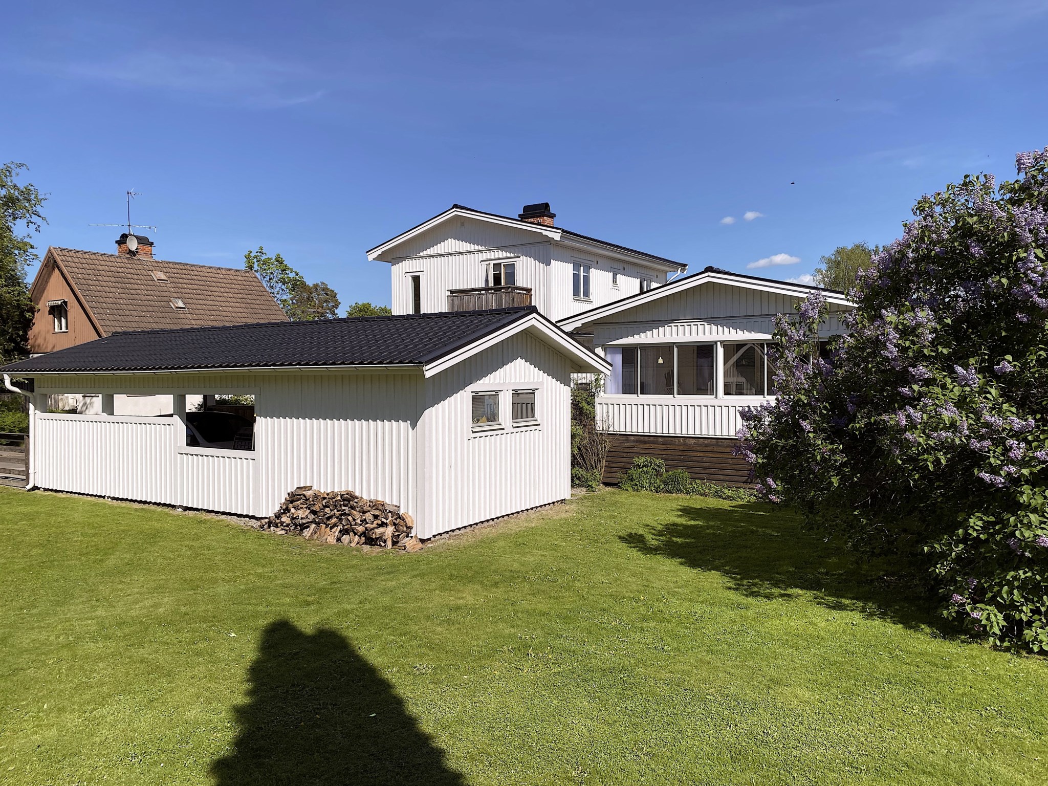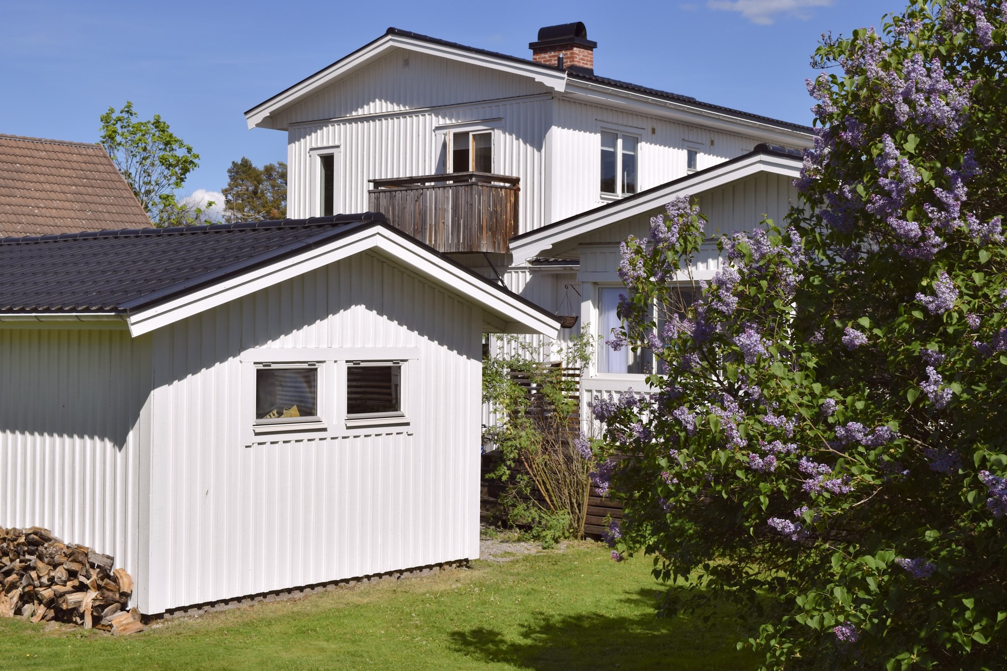 Villan är vackert placerad på en solig hörntomt, omgiven av grönska och en trädgård som lockar till både lek, vila och trädgårdsdrömmar. Den vita fasaden tillsammans med den välskötta tomten ger ett varmt och välkomnande första intryck.