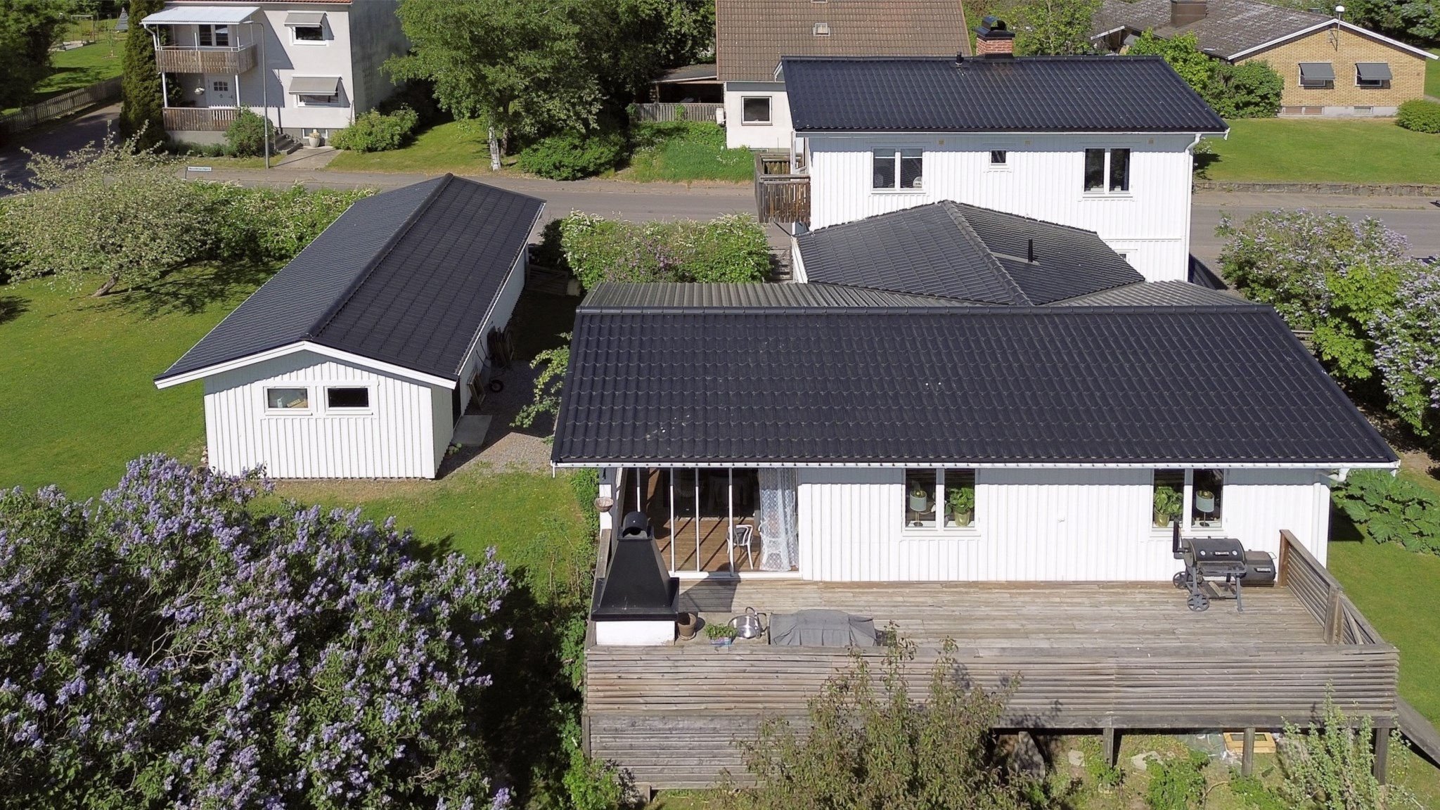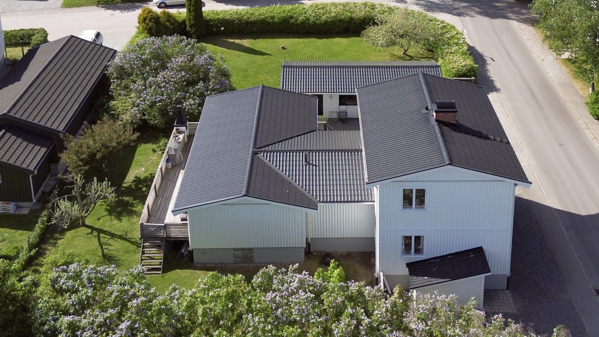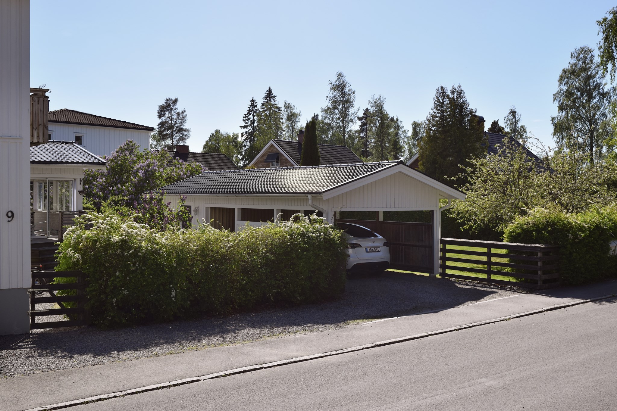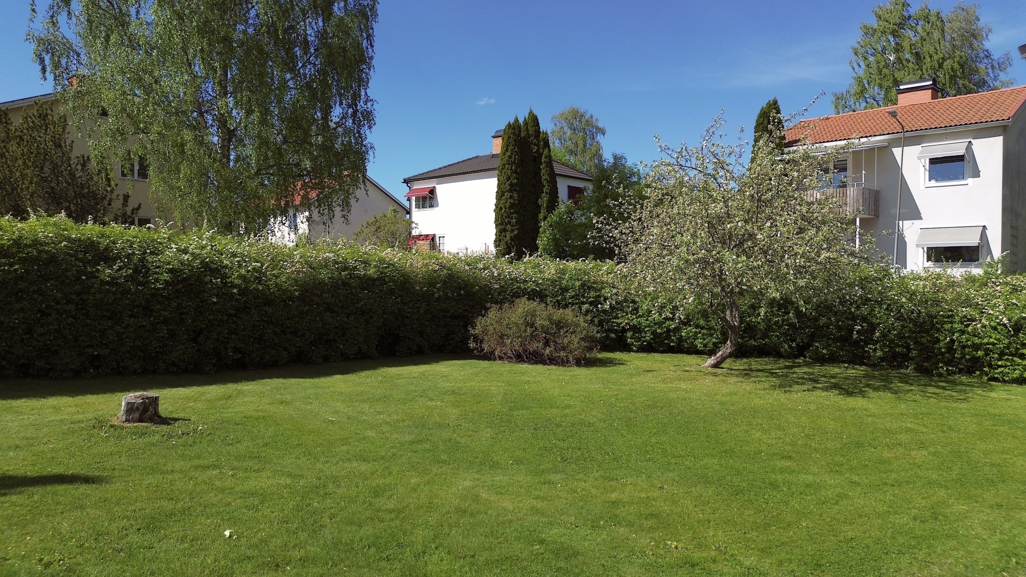 Villan är vackert placerad på en solig hörntomt, omgiven av grönska och en trädgård som lockar till både lek, vila och trädgårdsdrömmar. Den vita fasaden tillsammans med den välskötta tomten ger ett varmt och välkomnande första intryck.