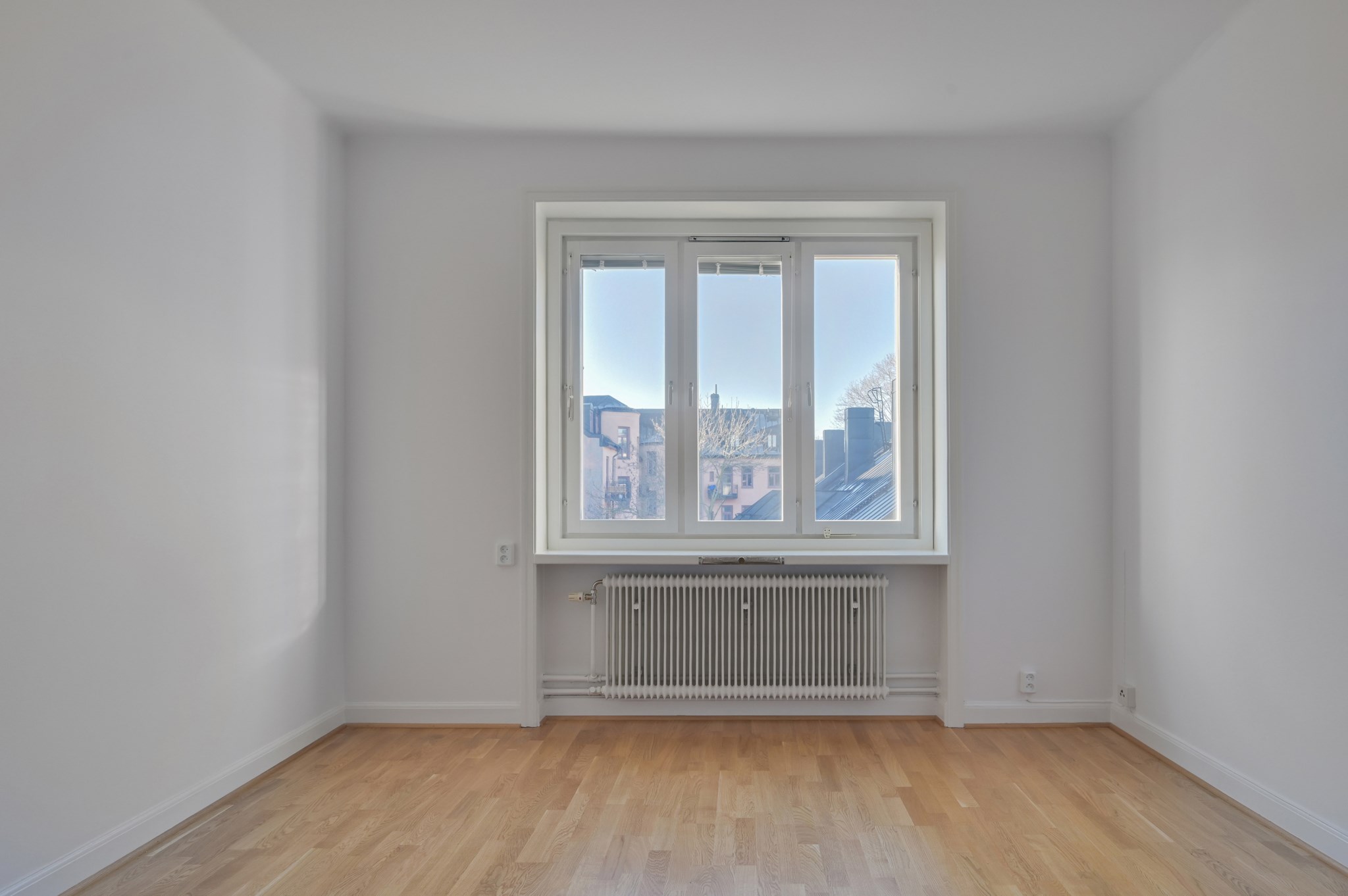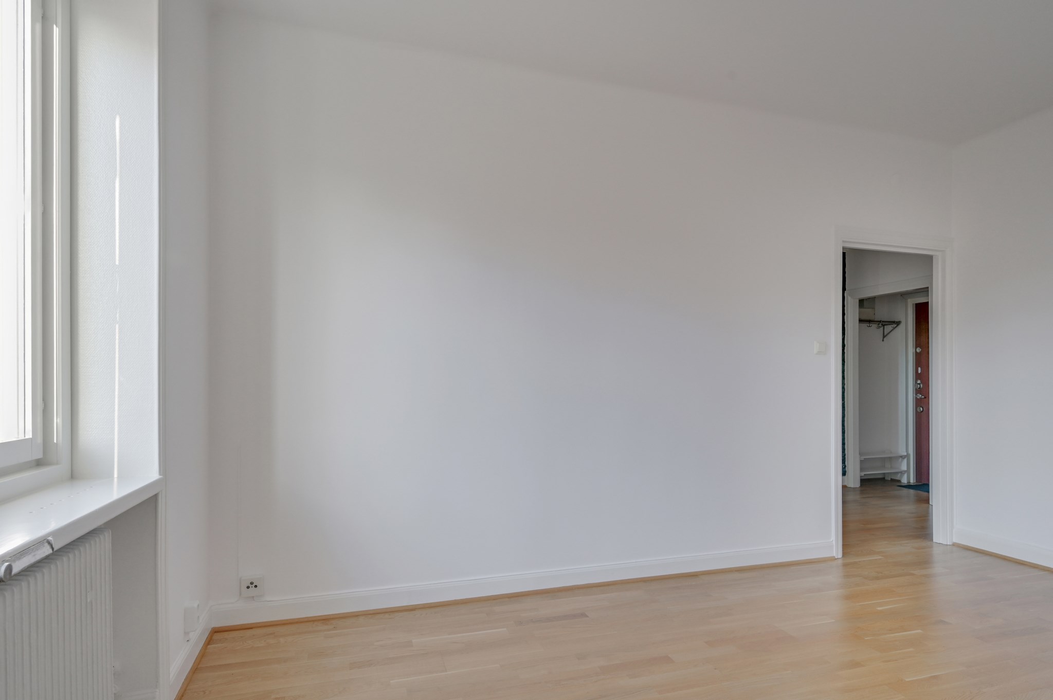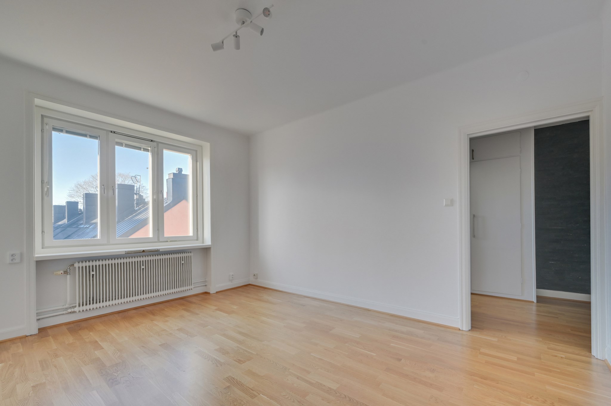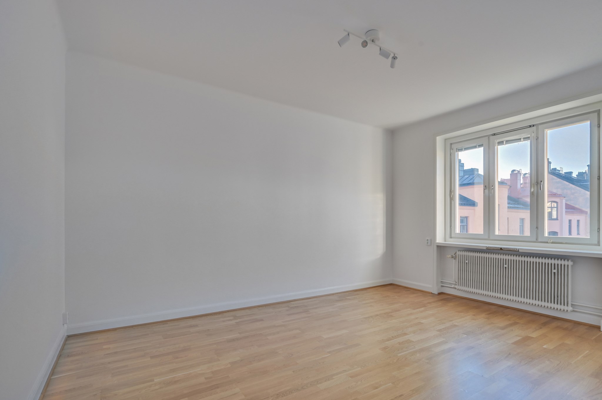Ljust fint rum med ett stort fönsterparti som gör att rummet badar i ljus. Här finns gott om plats för såväl soffa som soffbord och säng.