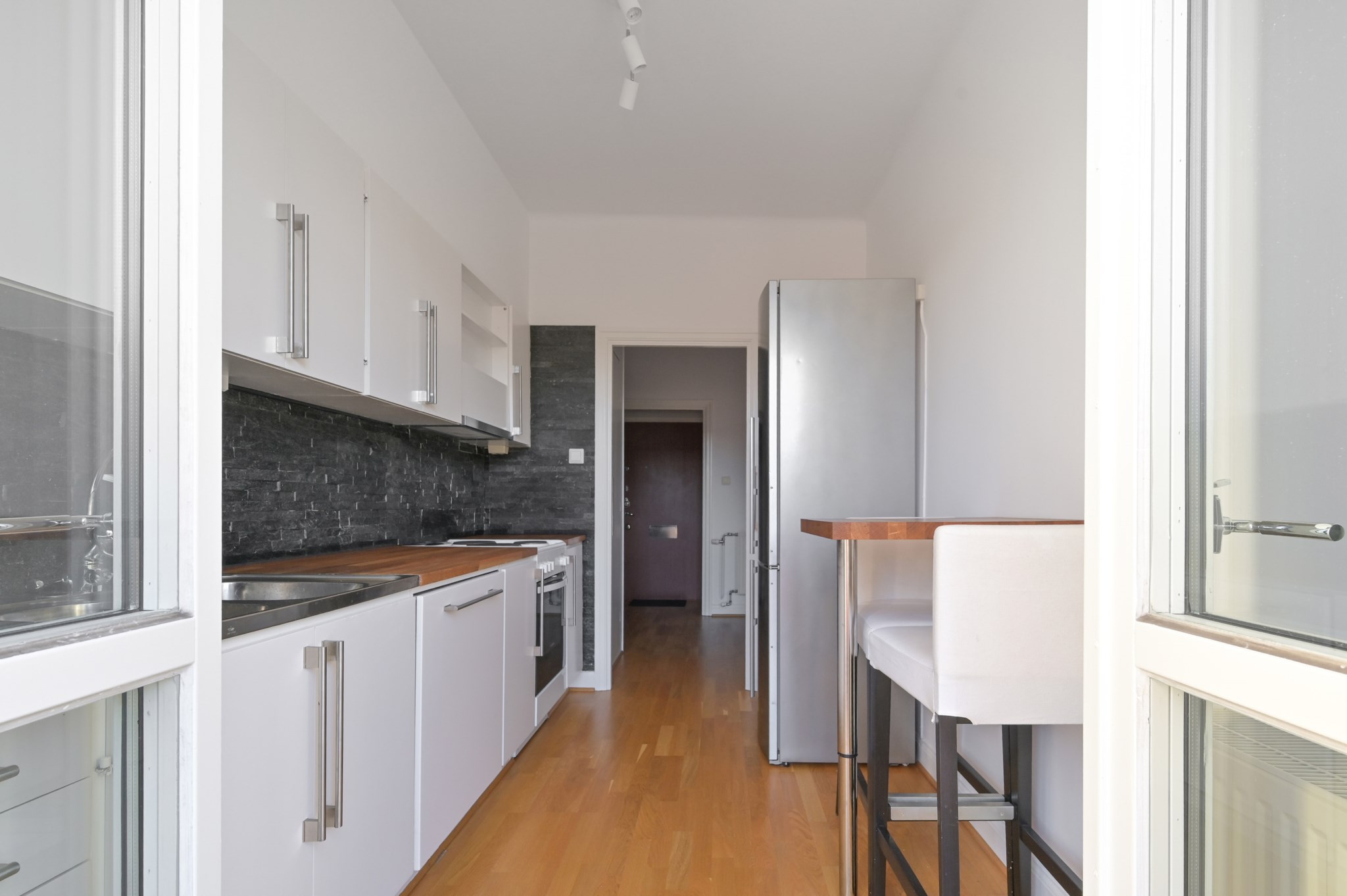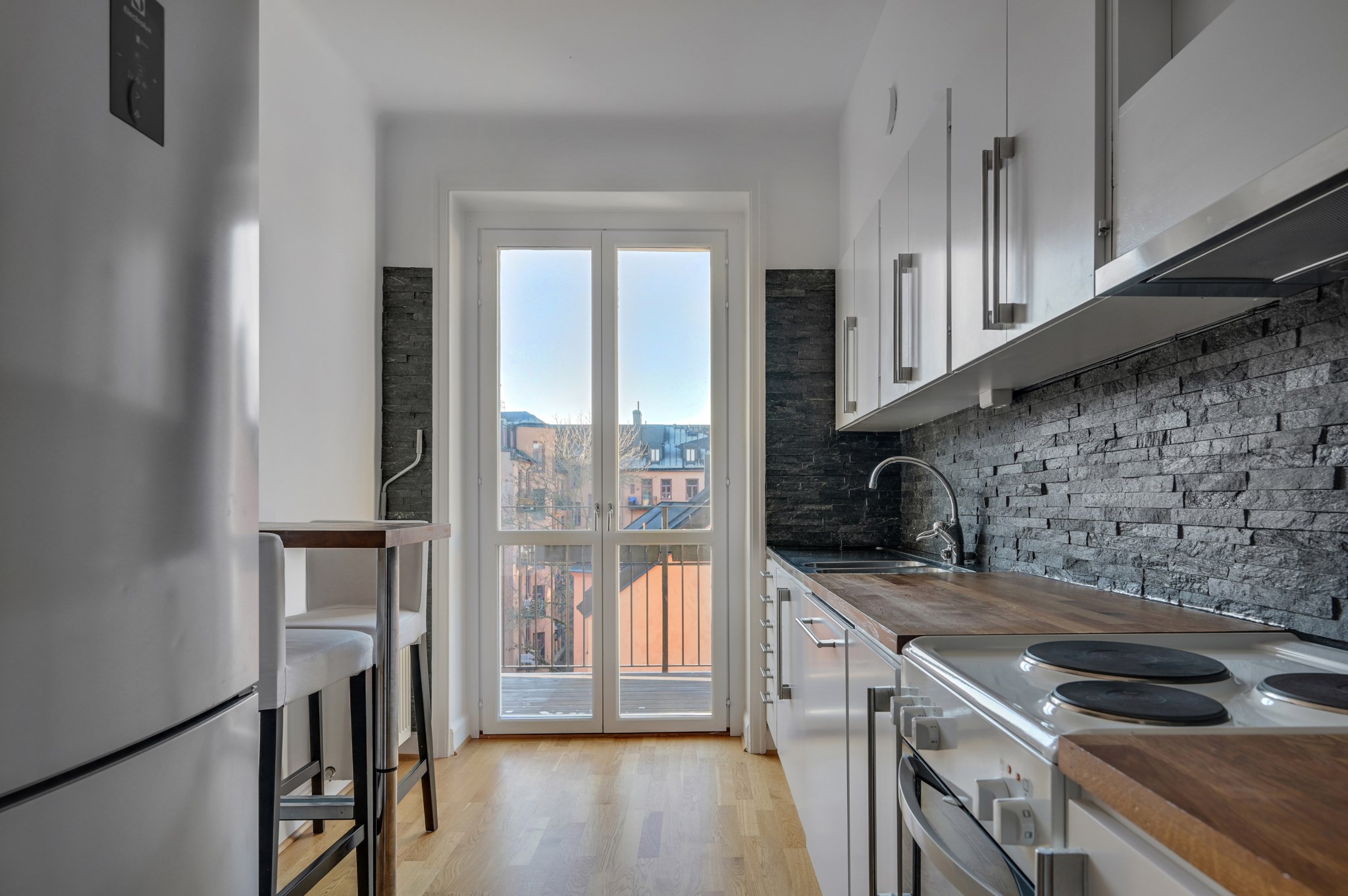Kök med gott om förvaring bakom vita skåpsluckor. Ovan arbetsytor i trä sitter ett svart kakel i stavar. I köksinredningen ingår: Spis, spisfläkt (kolfilter), diskmaskin samt kyl/frys.