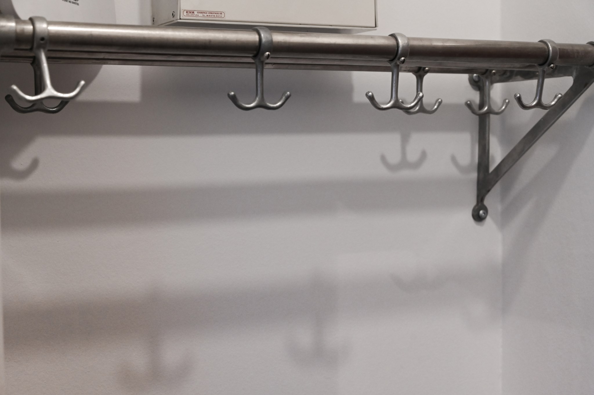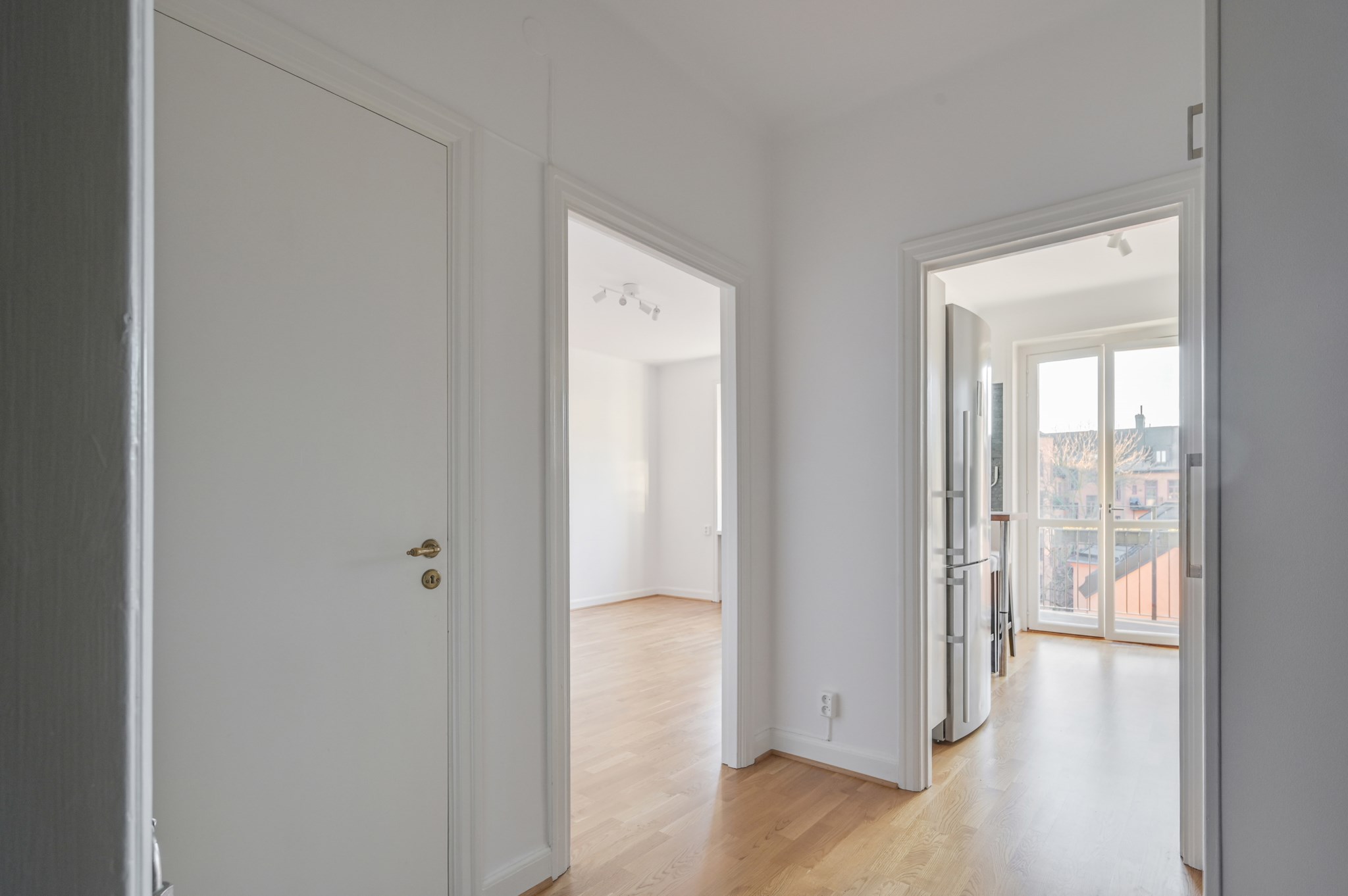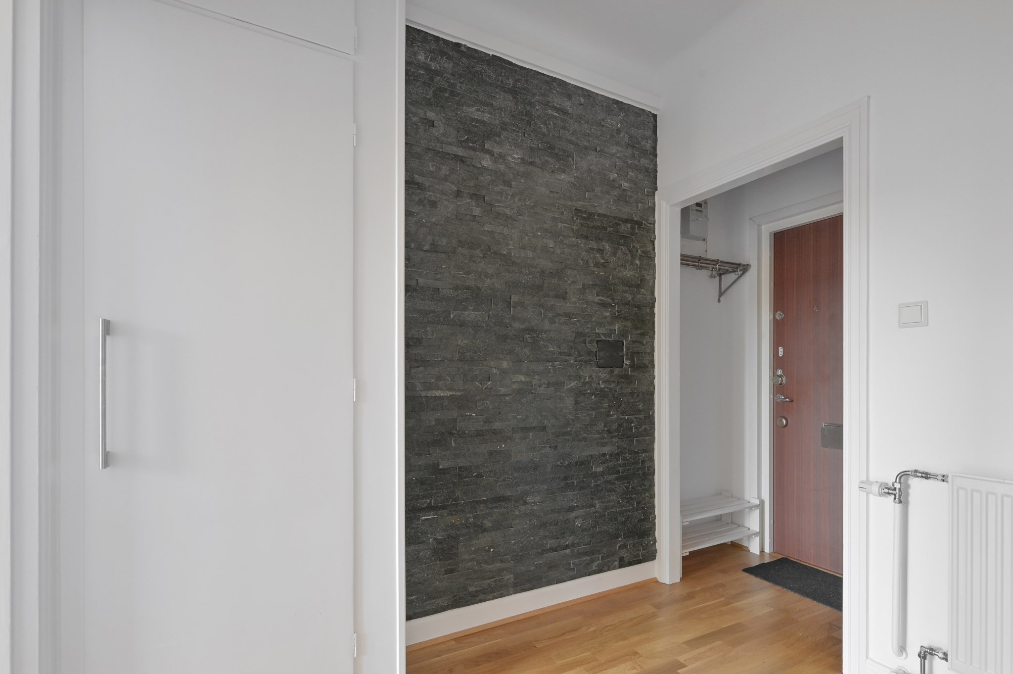Välkomnande hall med plats för avhängning vid entrén. Här finns en rejäl klädkammare samt en mindre garderob med överskåp. Hatthyllan i original finns bevarad och en säkerhetsdörr är installerad.