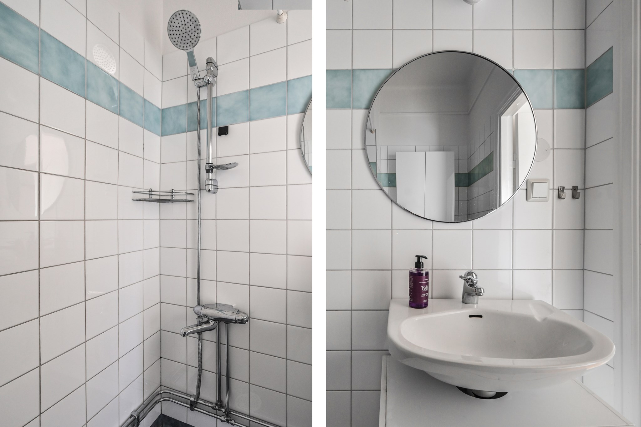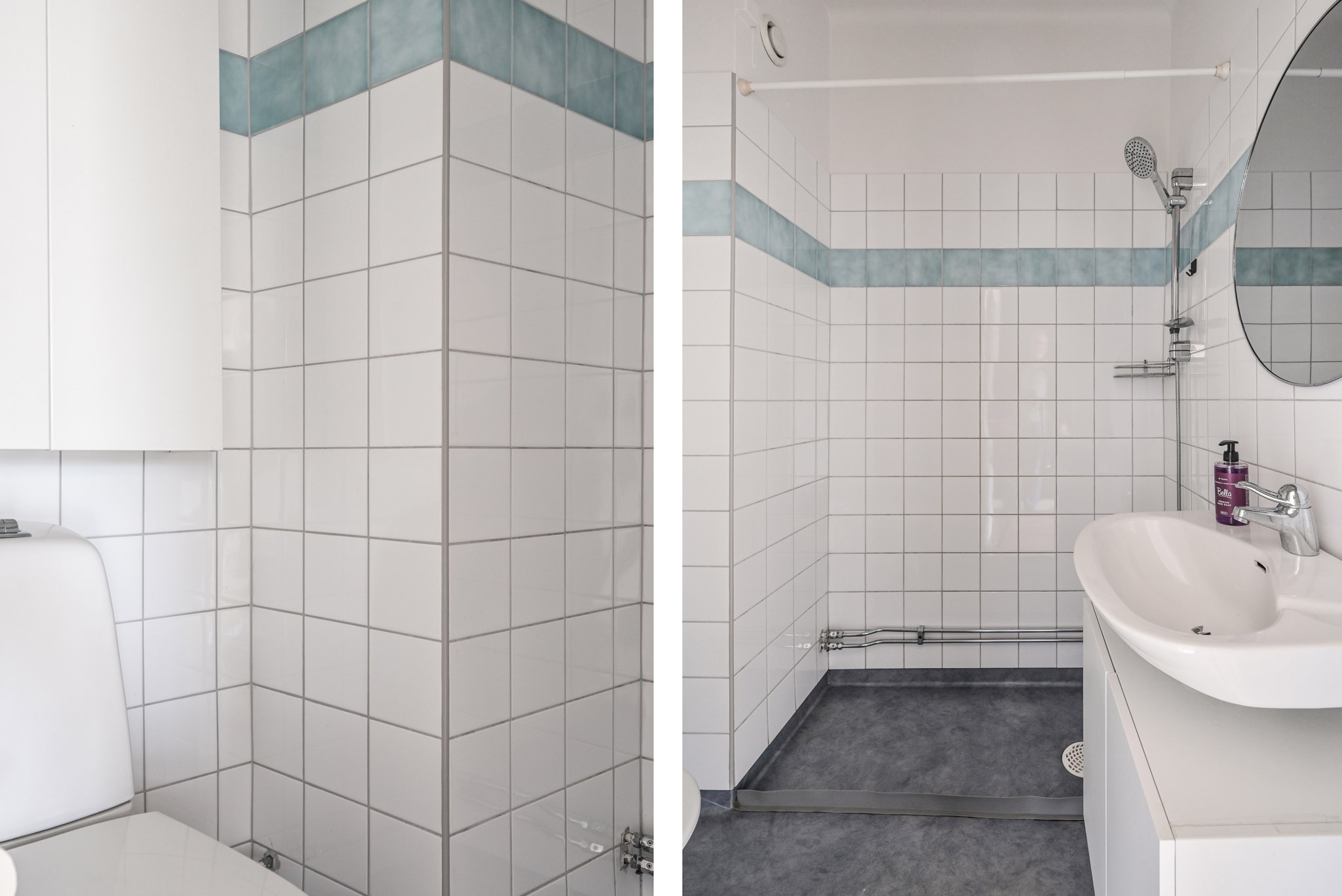 Fräscht badrum med vitt kakel med blå bård och på golvet ligger en matchande våtrumsmatta. I badrumsinredningen ingår: dusch, spegel, handfat med kommod under, badrumsskåp samt wc. Det finns plats för badkar som önskar det.