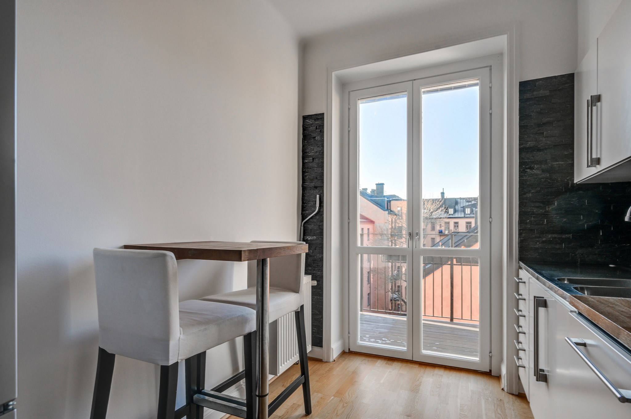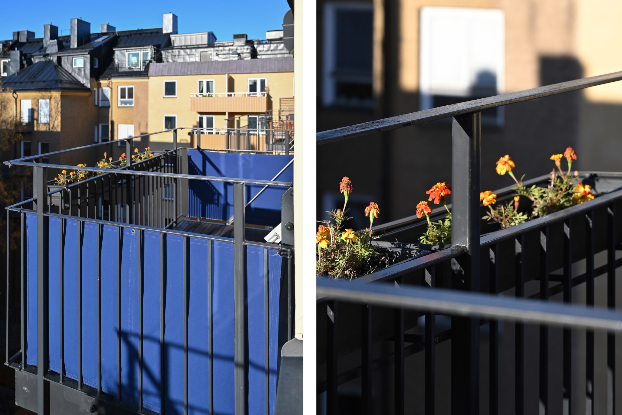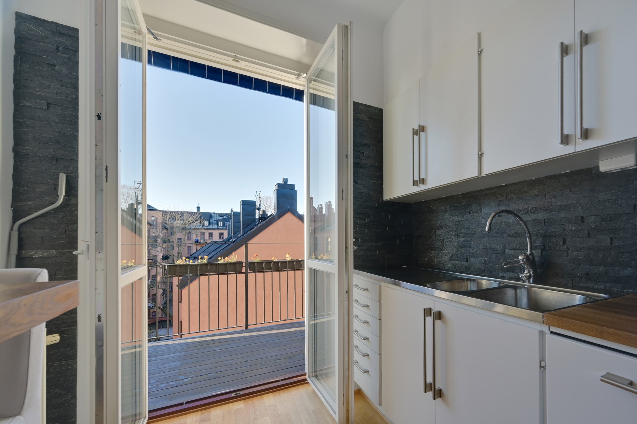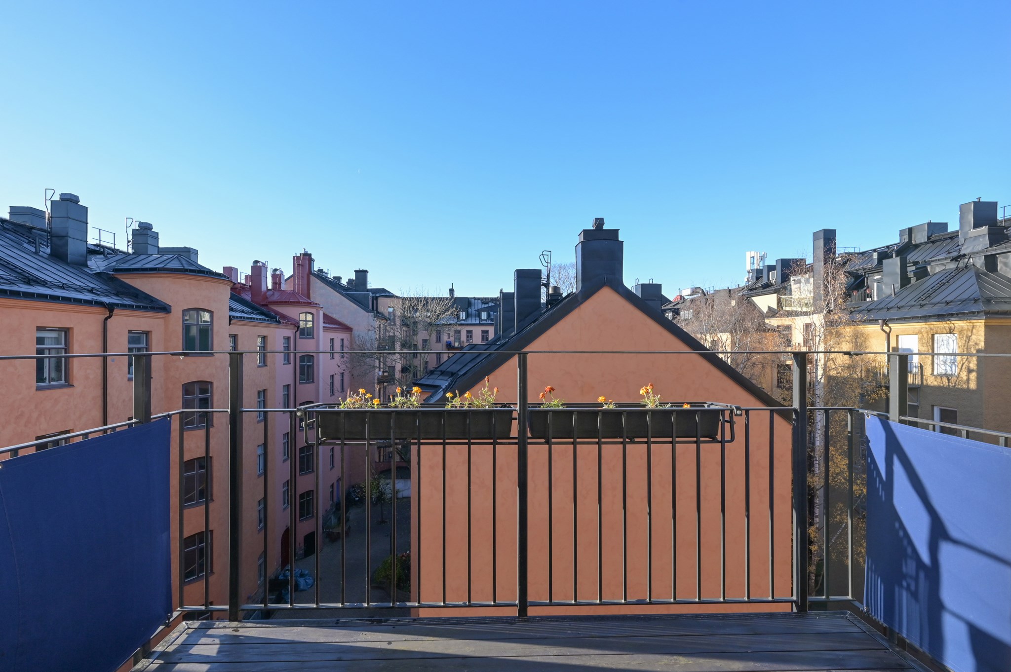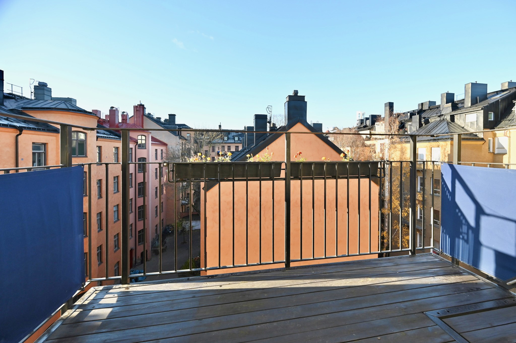 På den stora balkongen kan du verkligen njuta av solen under varma sommardagar då balkongen ligger i bästa läge, sydväst. Här finns gott om plats för såväl bord och stolar som för dig med gröna fingrar som önskar odla. På golvet ligger en trätrall samt att en markis är installerad.