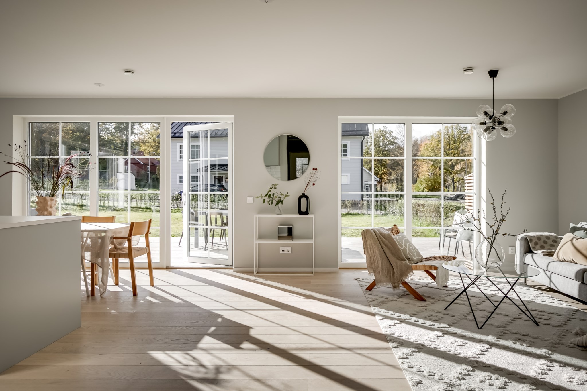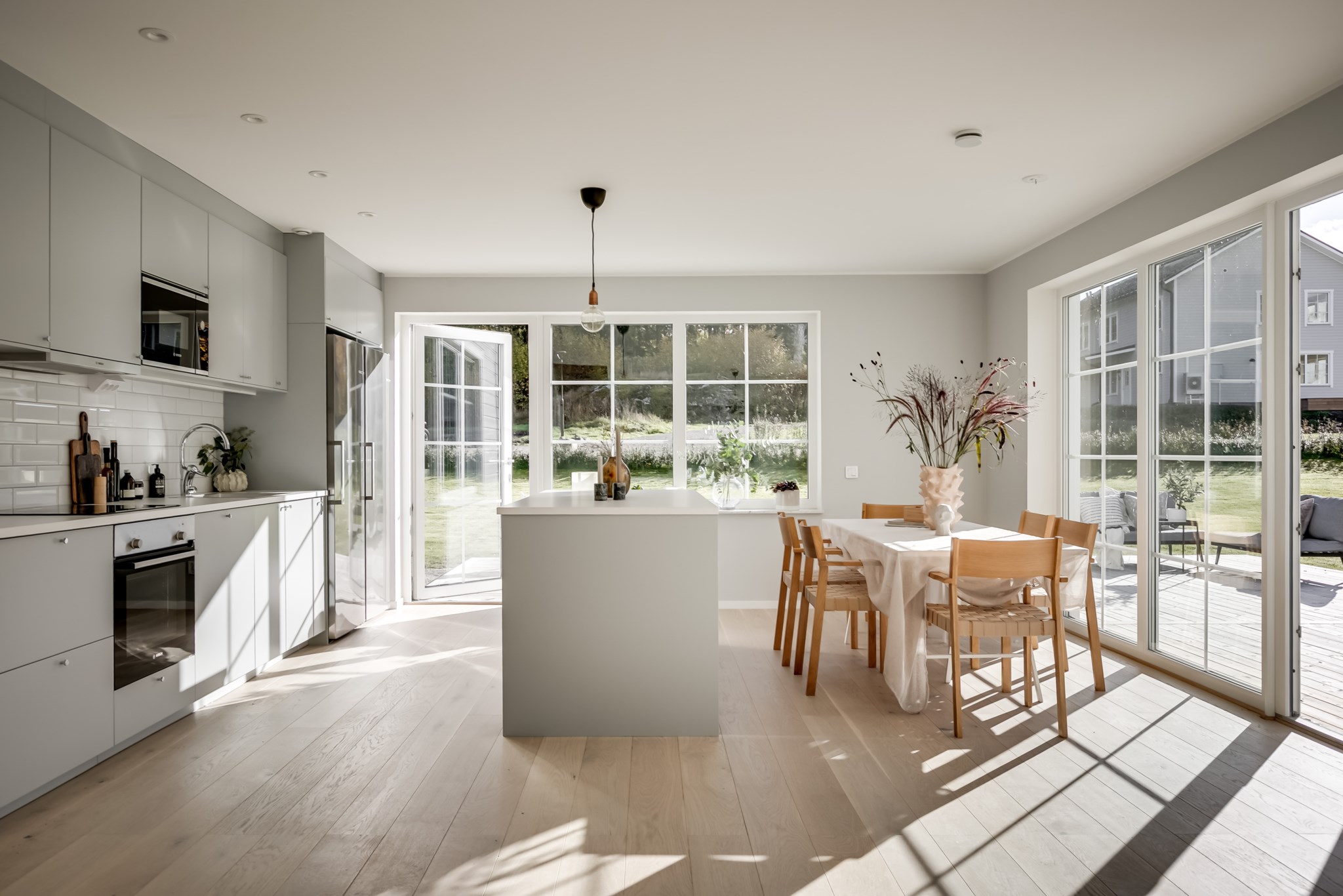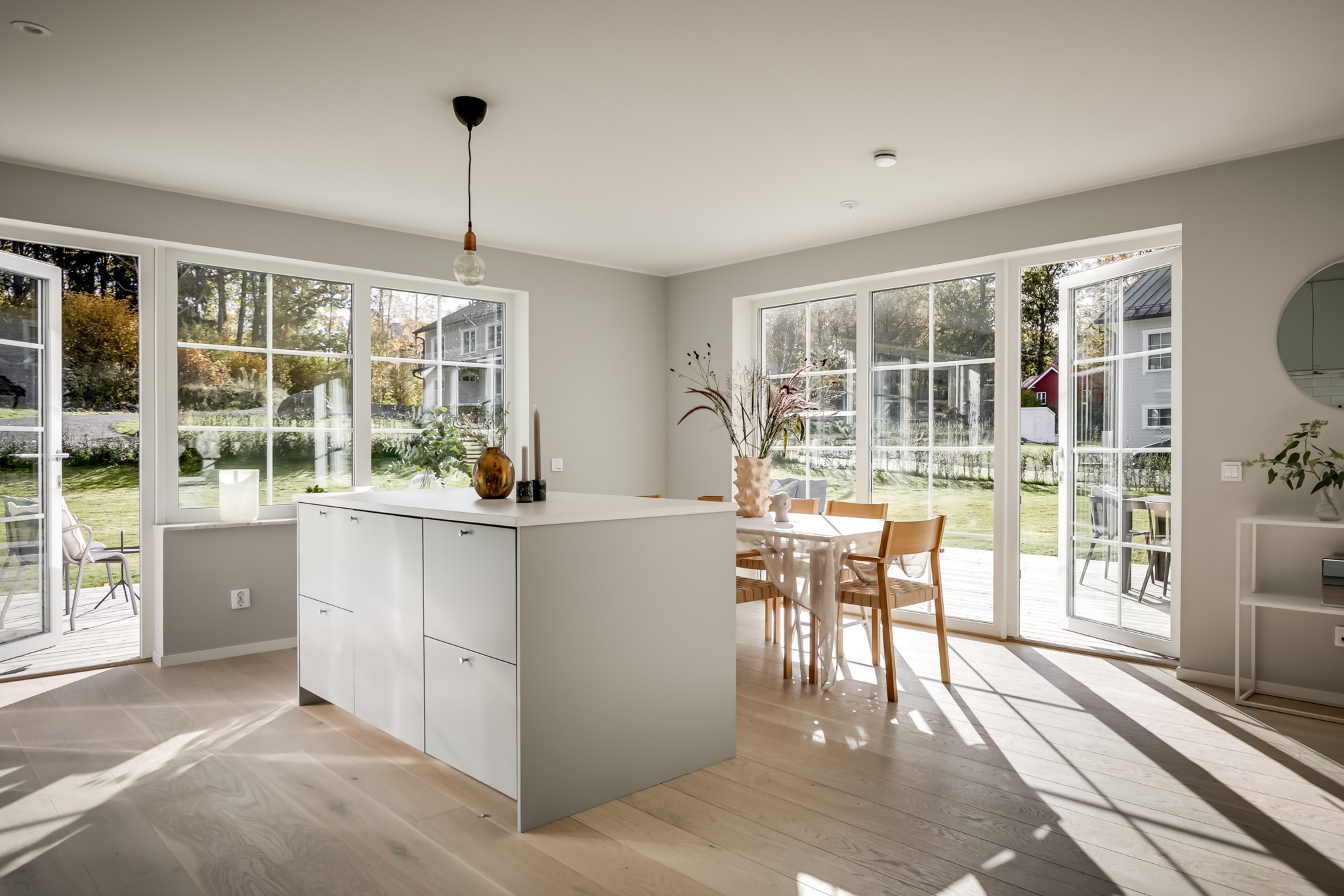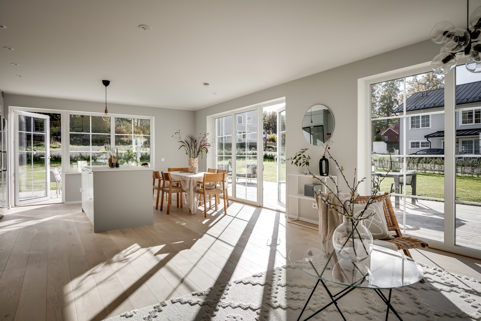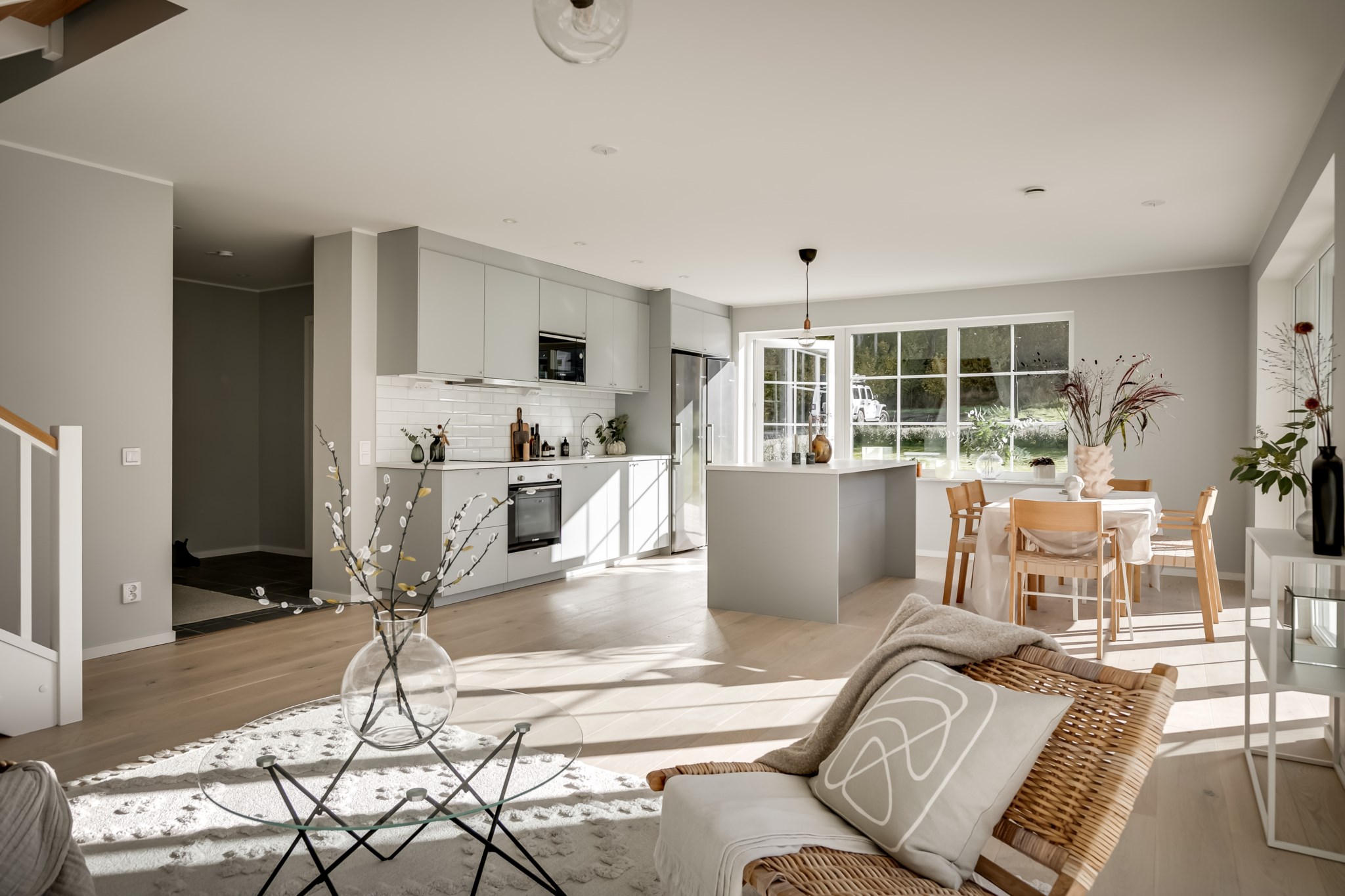 På entréplan välkomnas du av stor sällskapsyta med vardagsrum och kök i öppen planlösning.