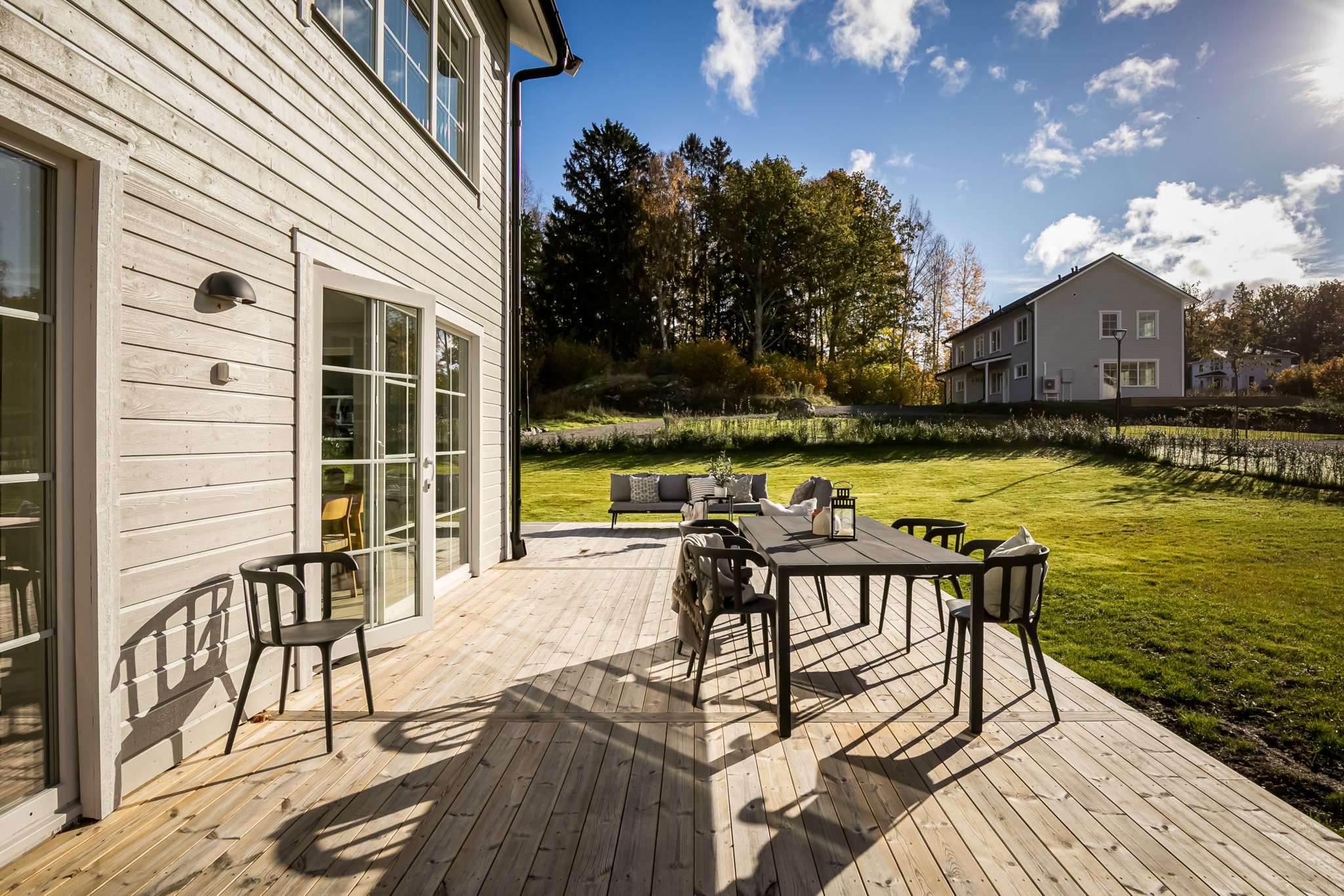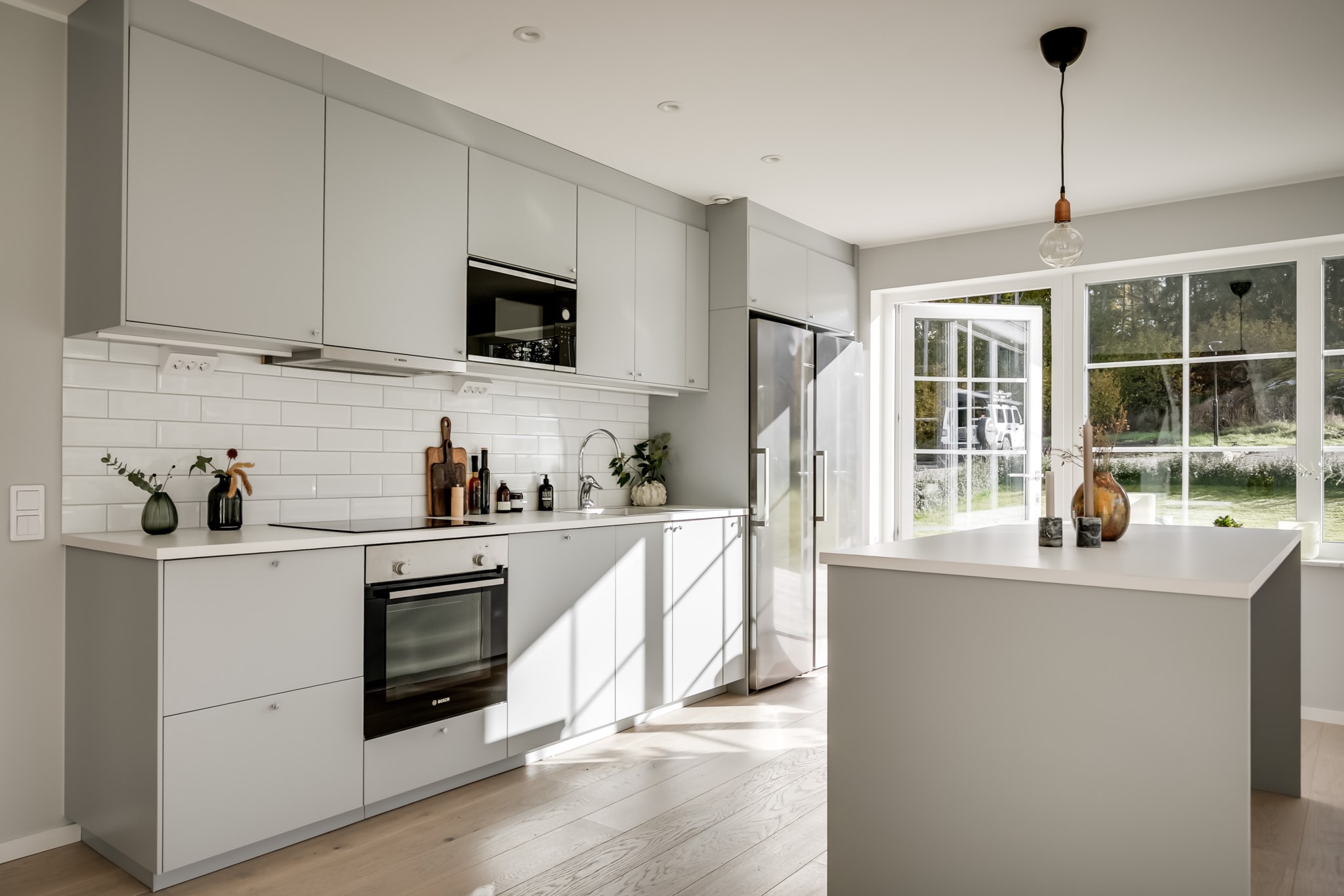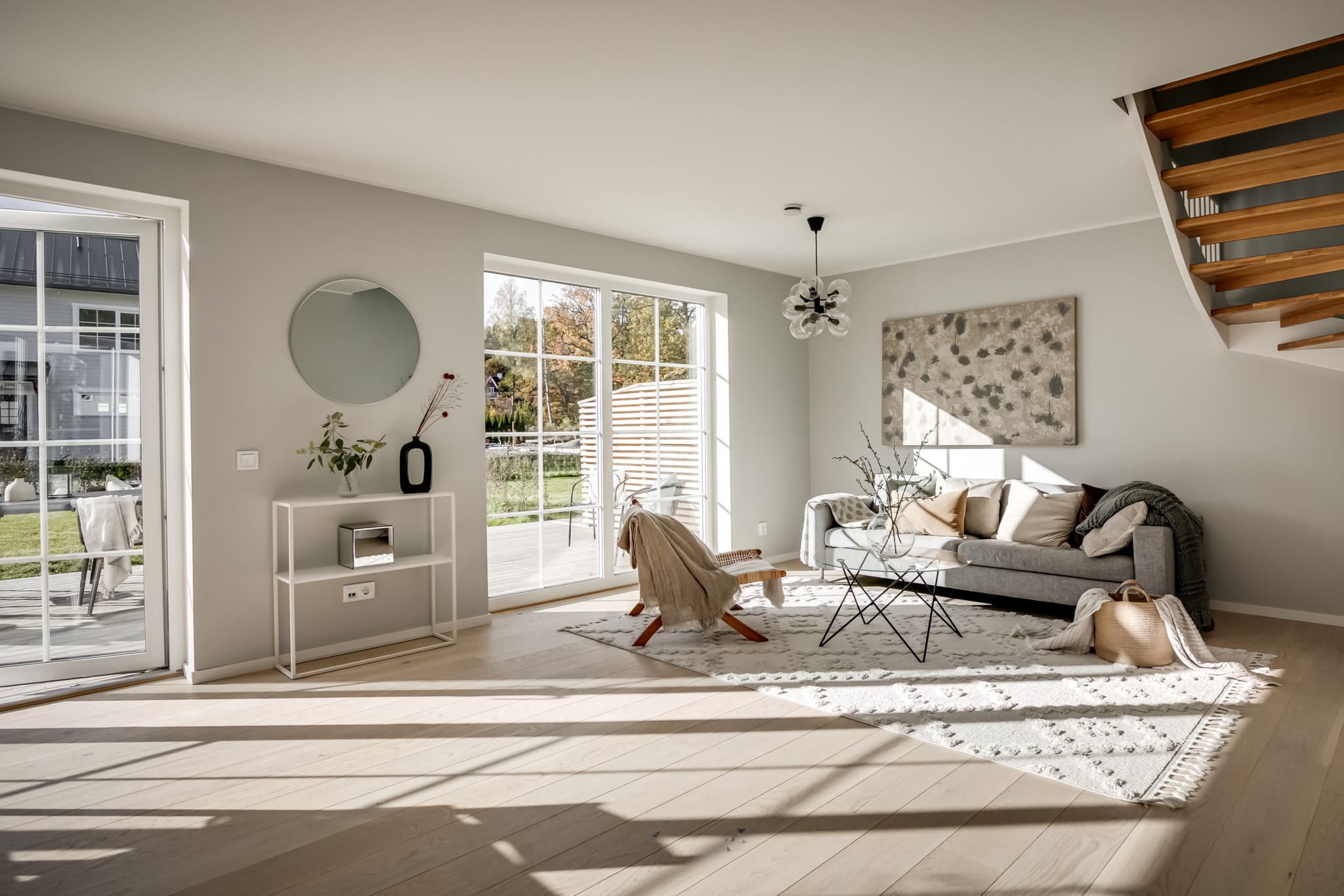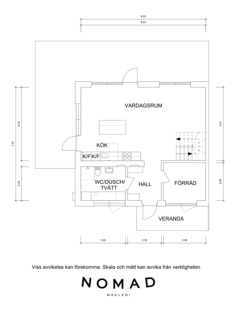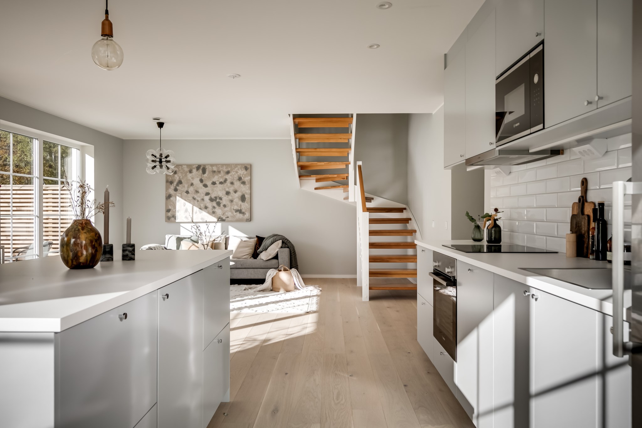 På entréplan välkomnas du av stor sällskapsyta med vardagsrum och kök i öppen planlösning.