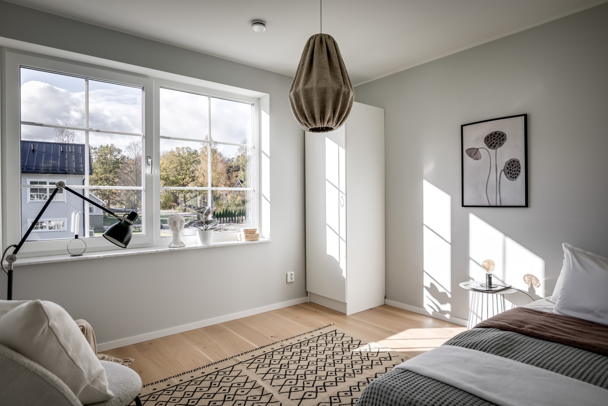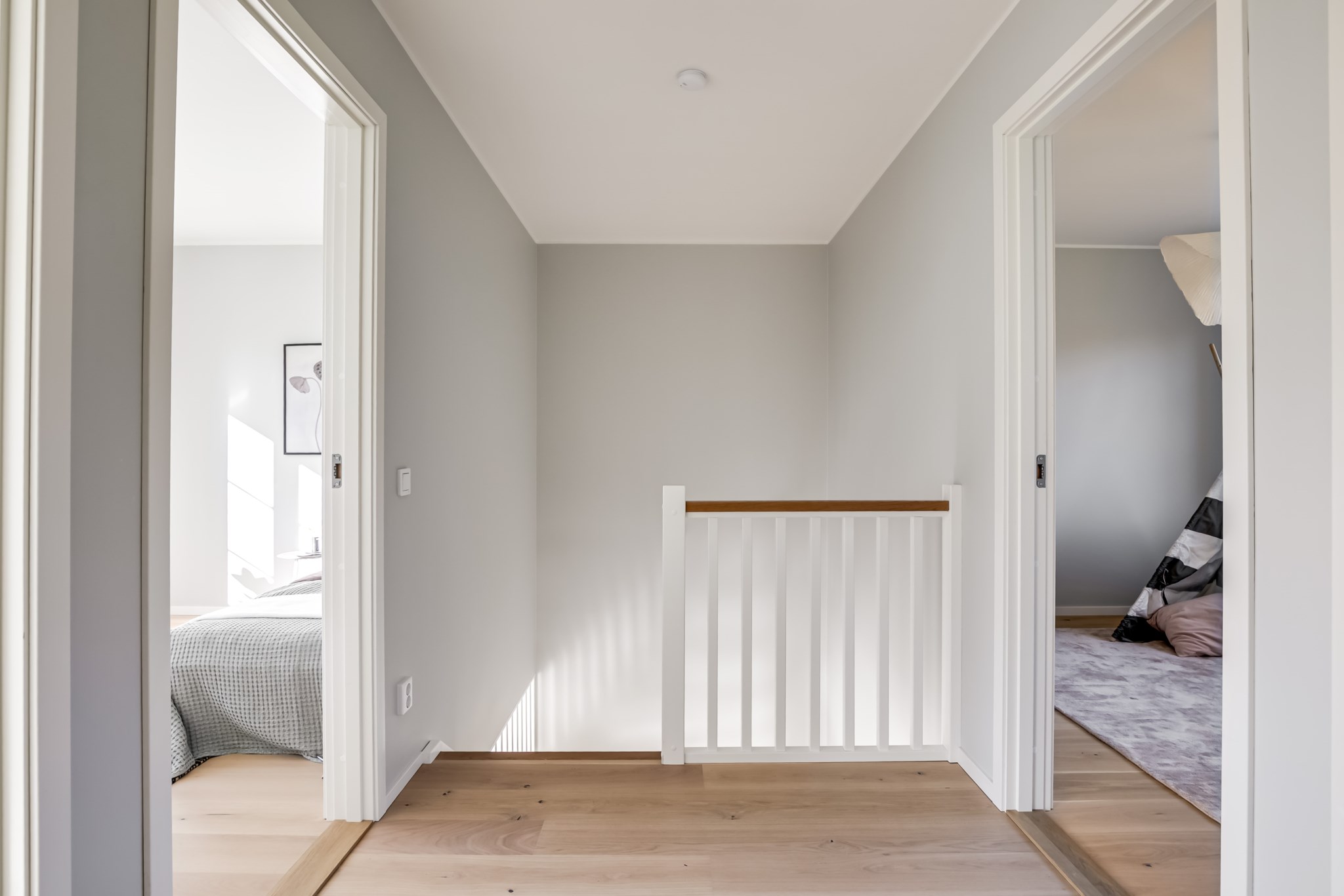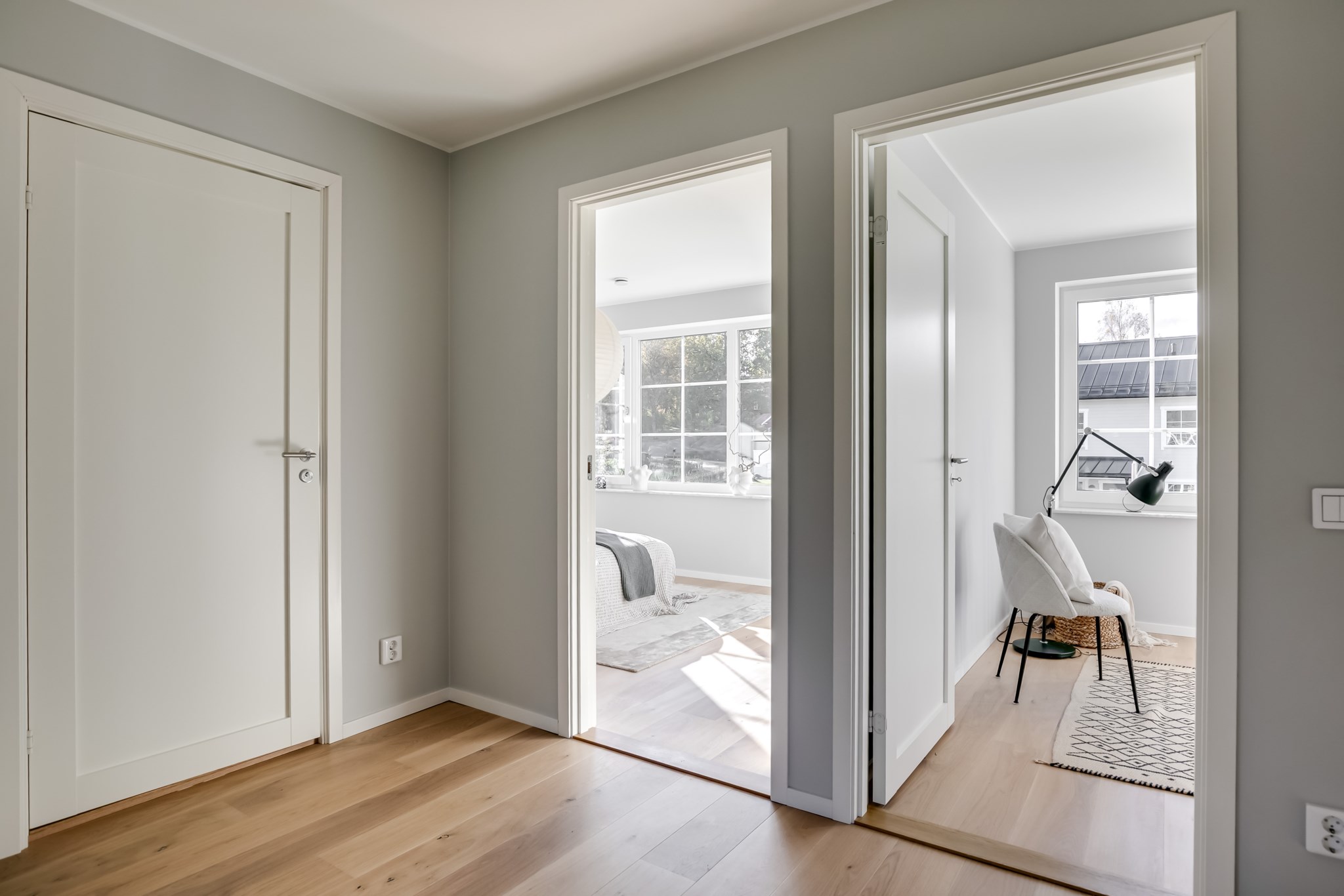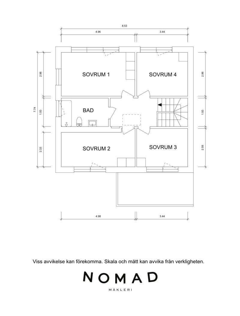 På övre plan finns fyra sovrum i tre olika väderstreck och badrum med badkar.
