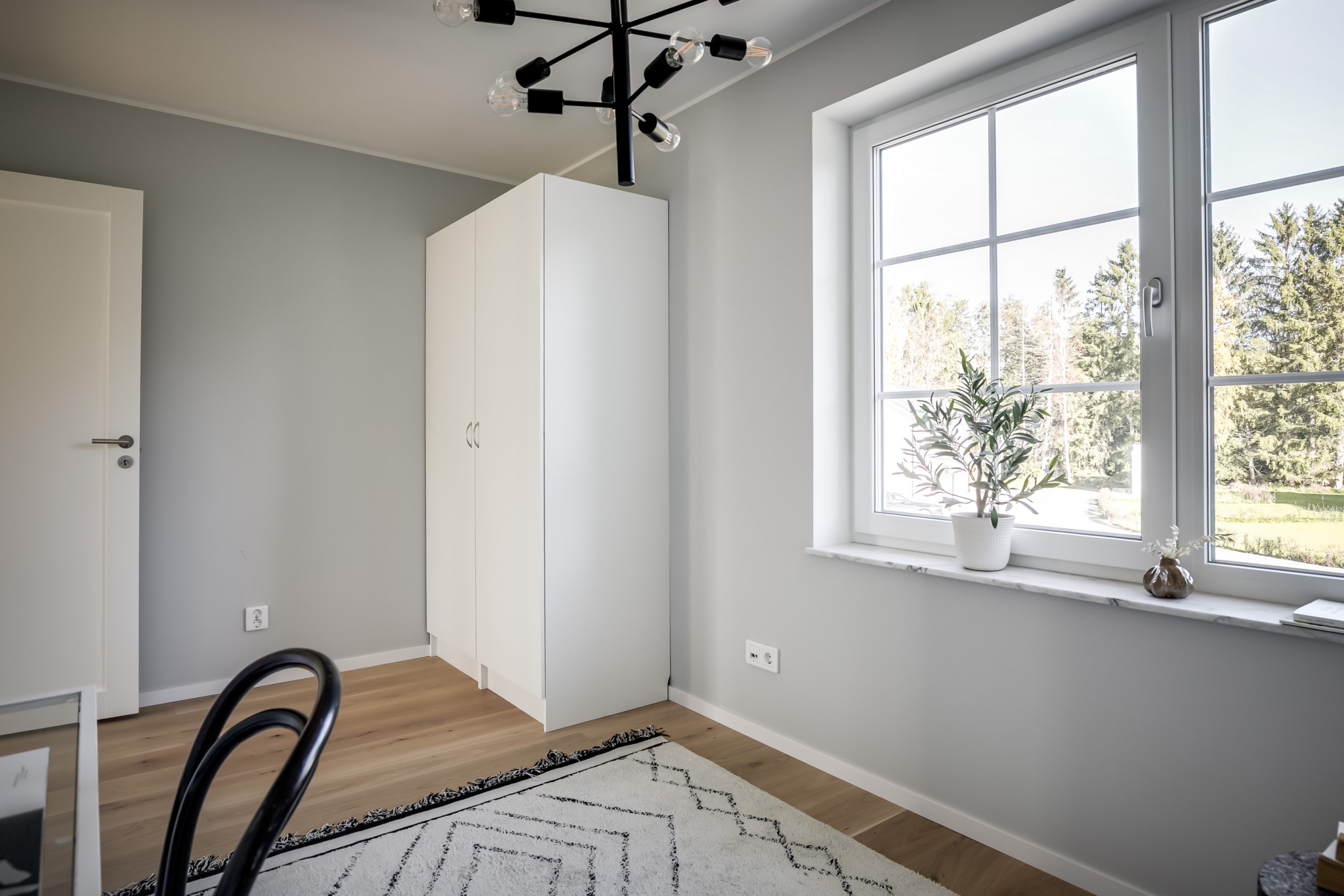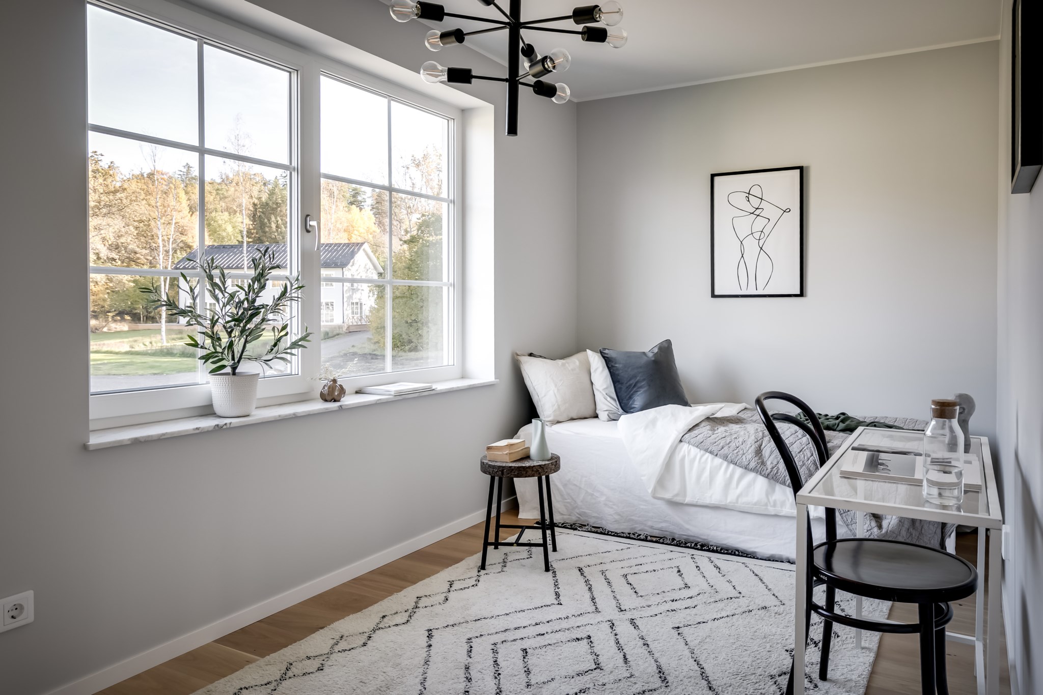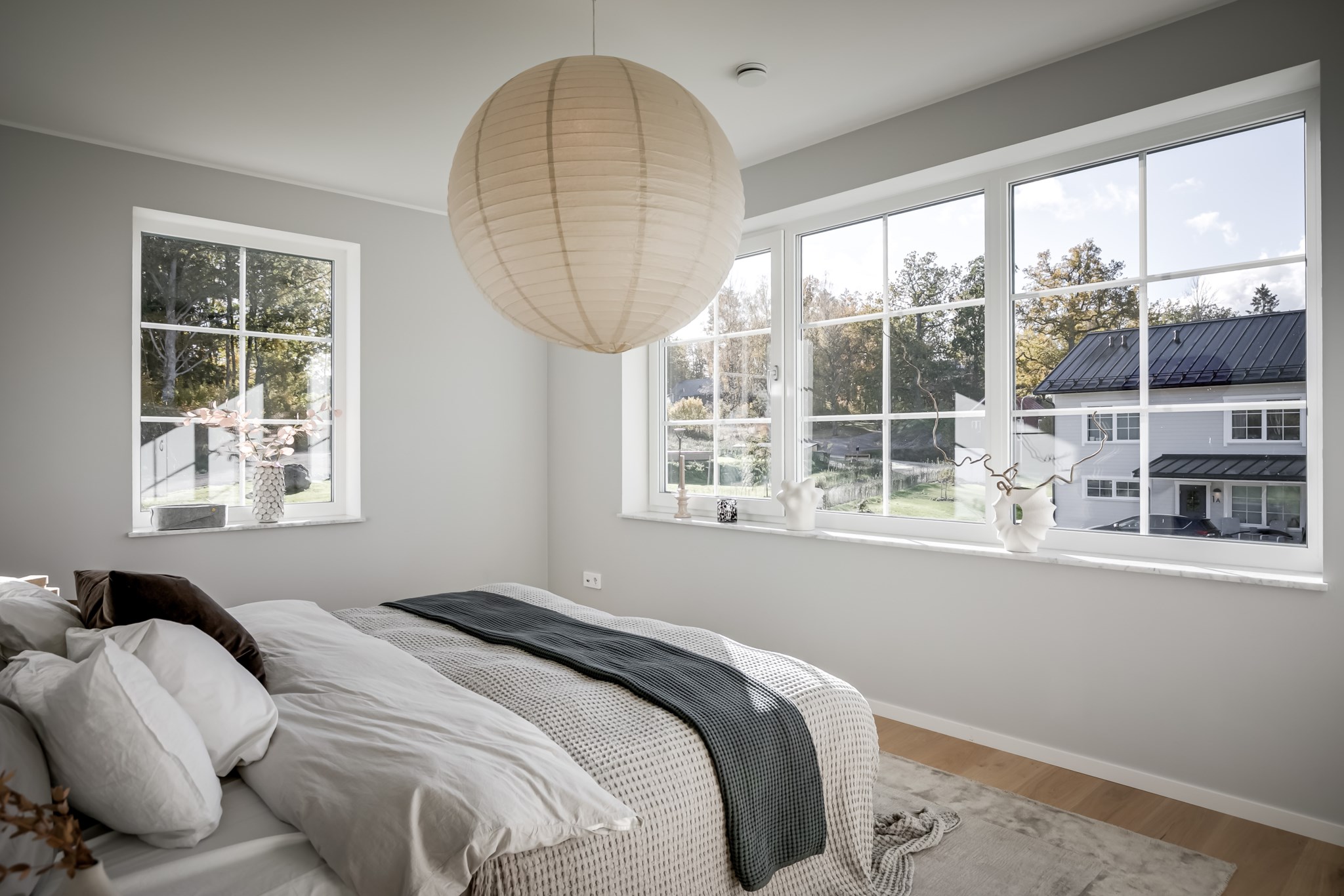 På övre plan finns fyra sovrum i tre olika väderstreck och badrum med badkar.