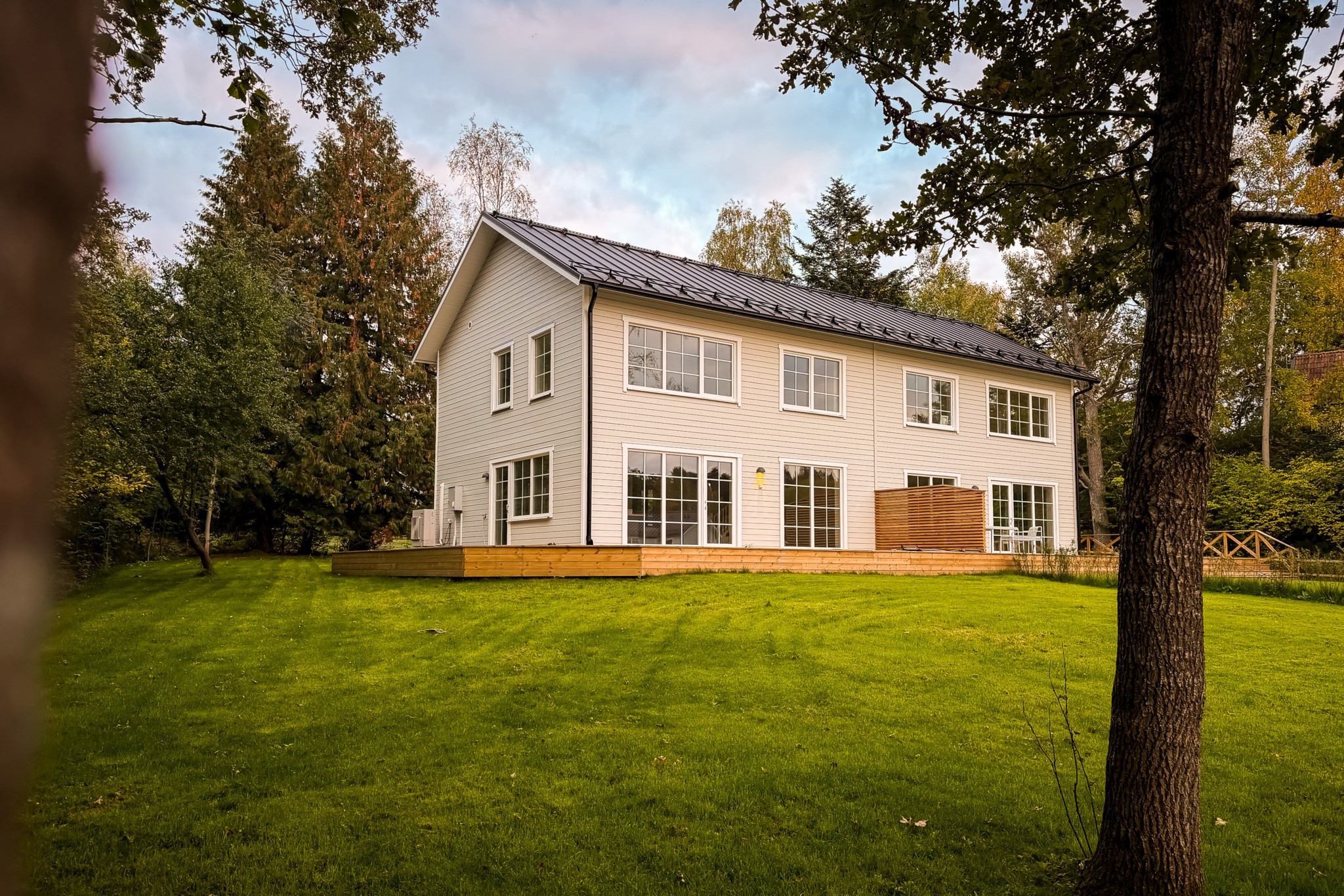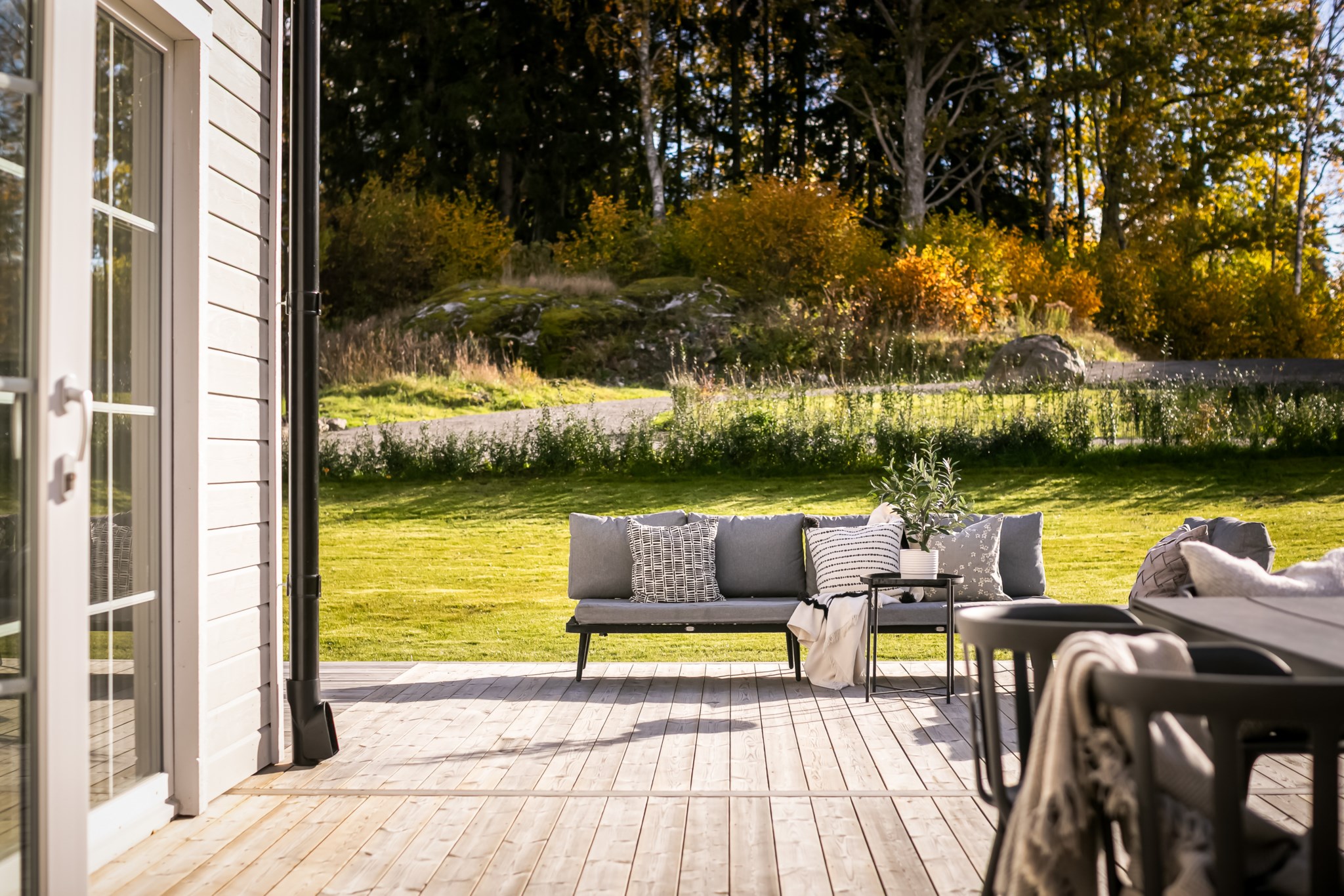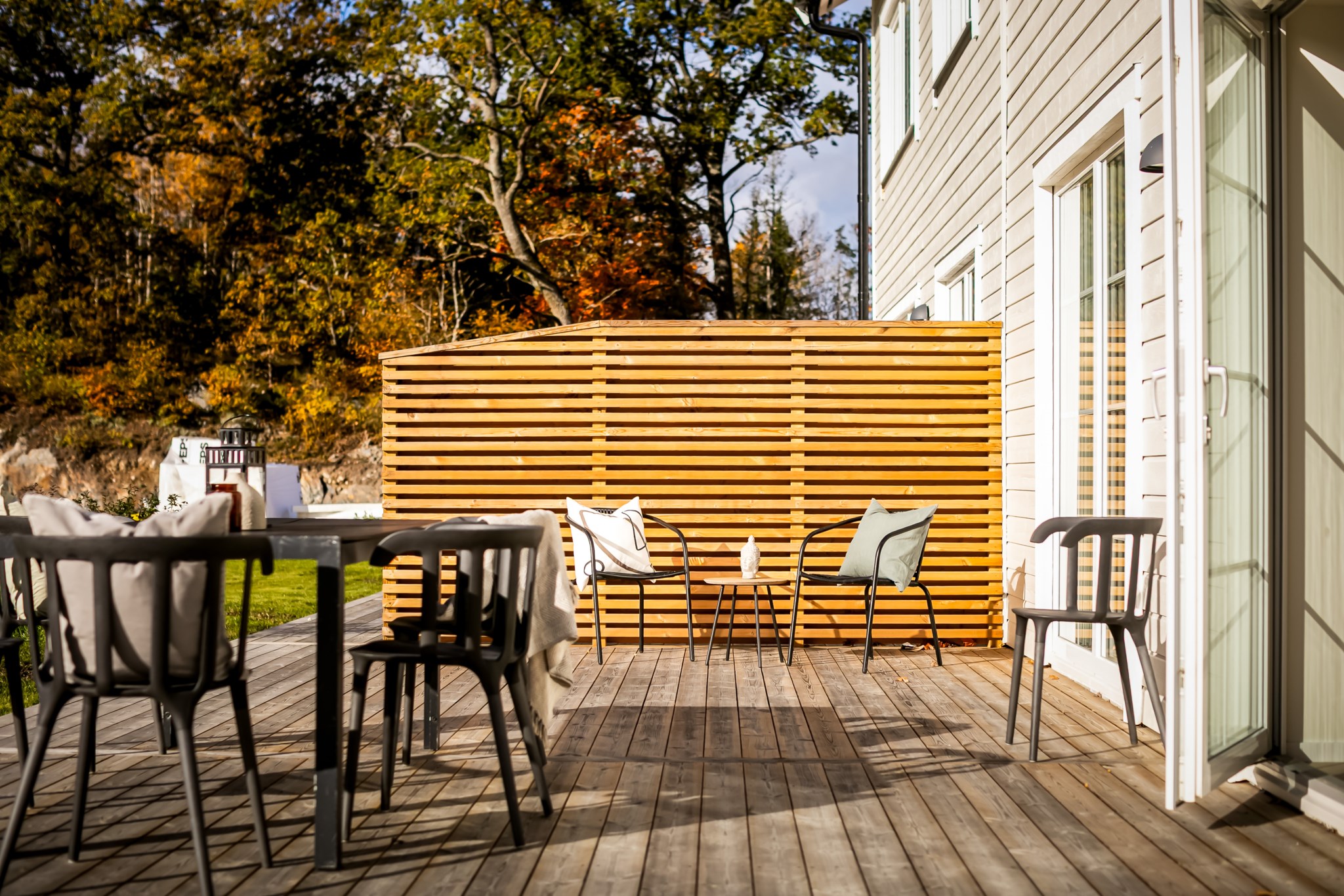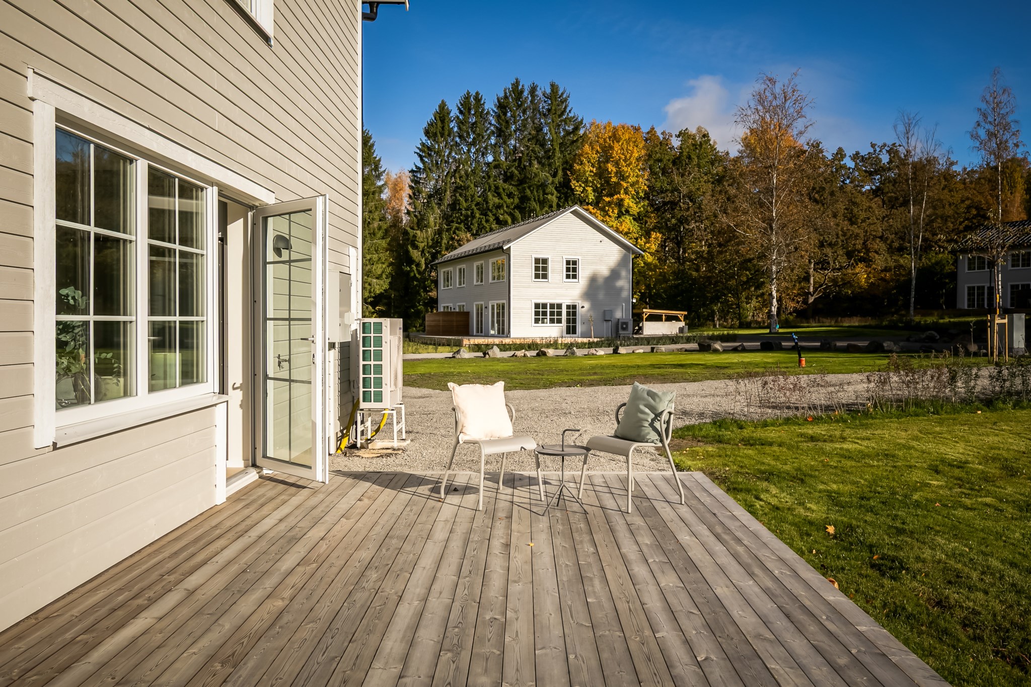 Det finns två utgångar till den trädäckade altanen som sträcker sig runt huset. Badrum med tvättstuga och ett mindre sovrum/förråd.