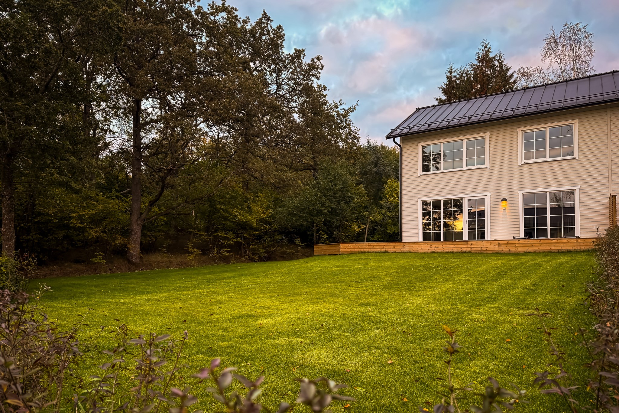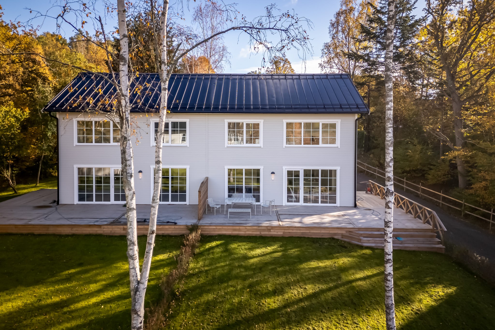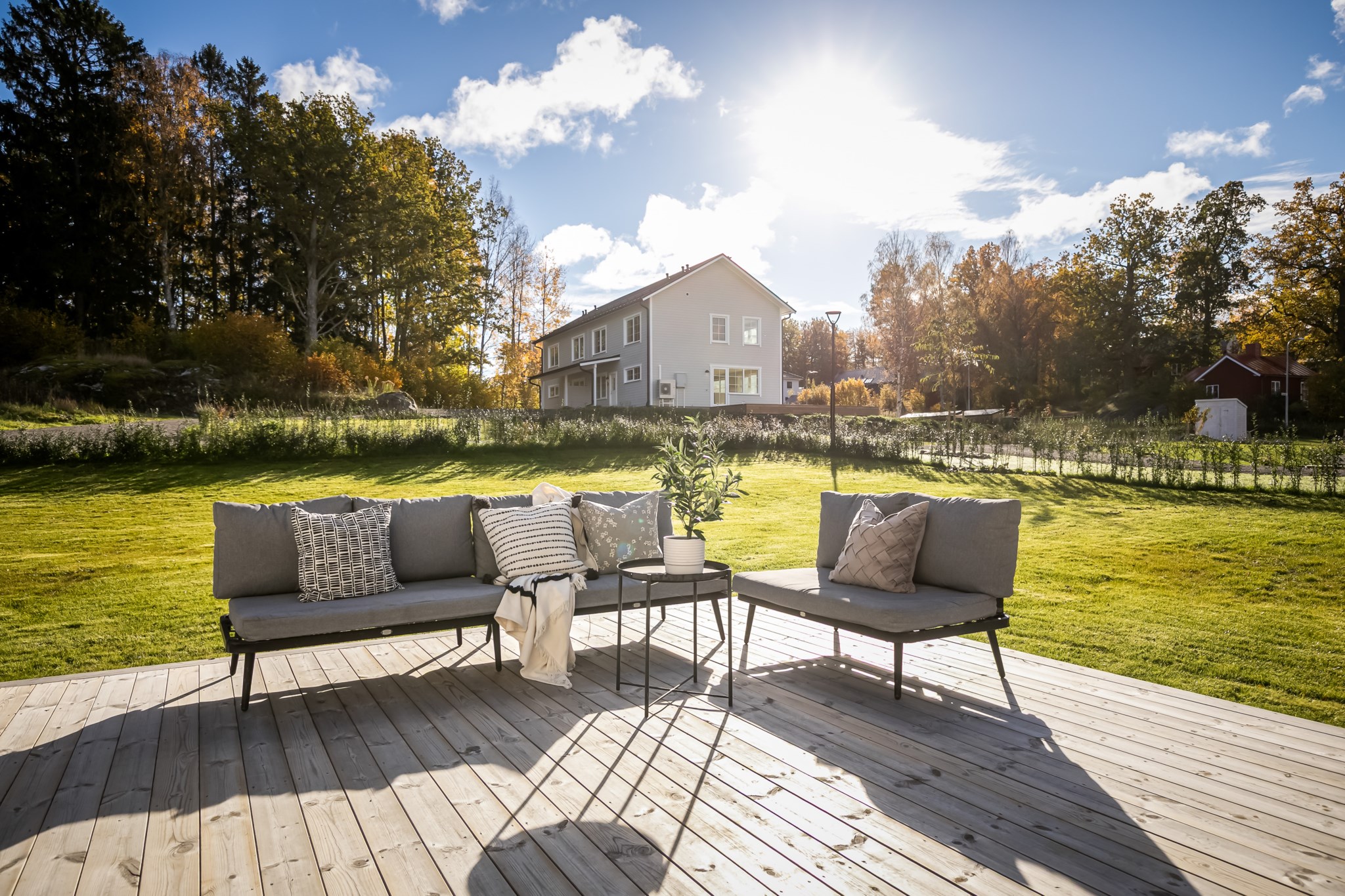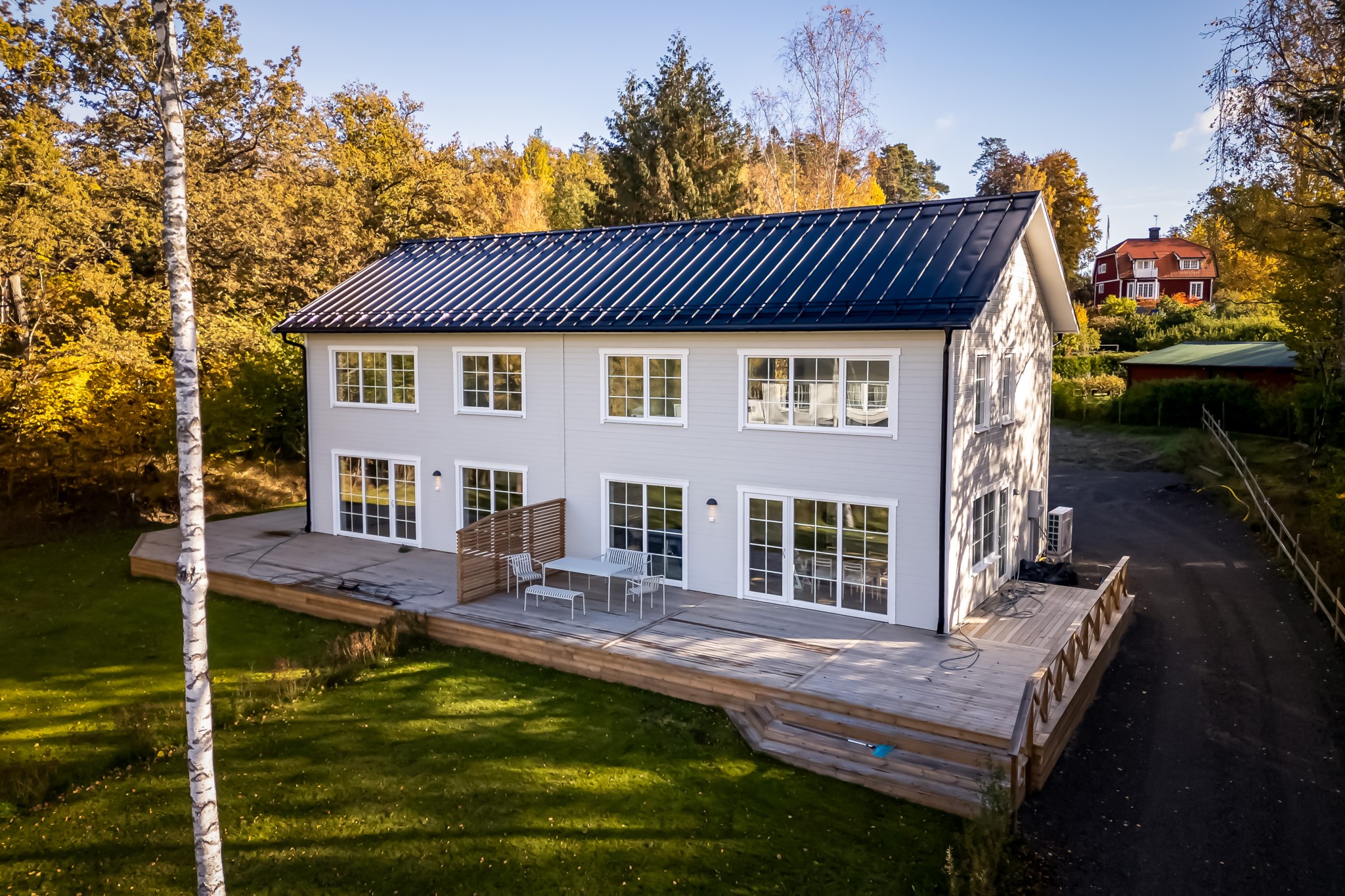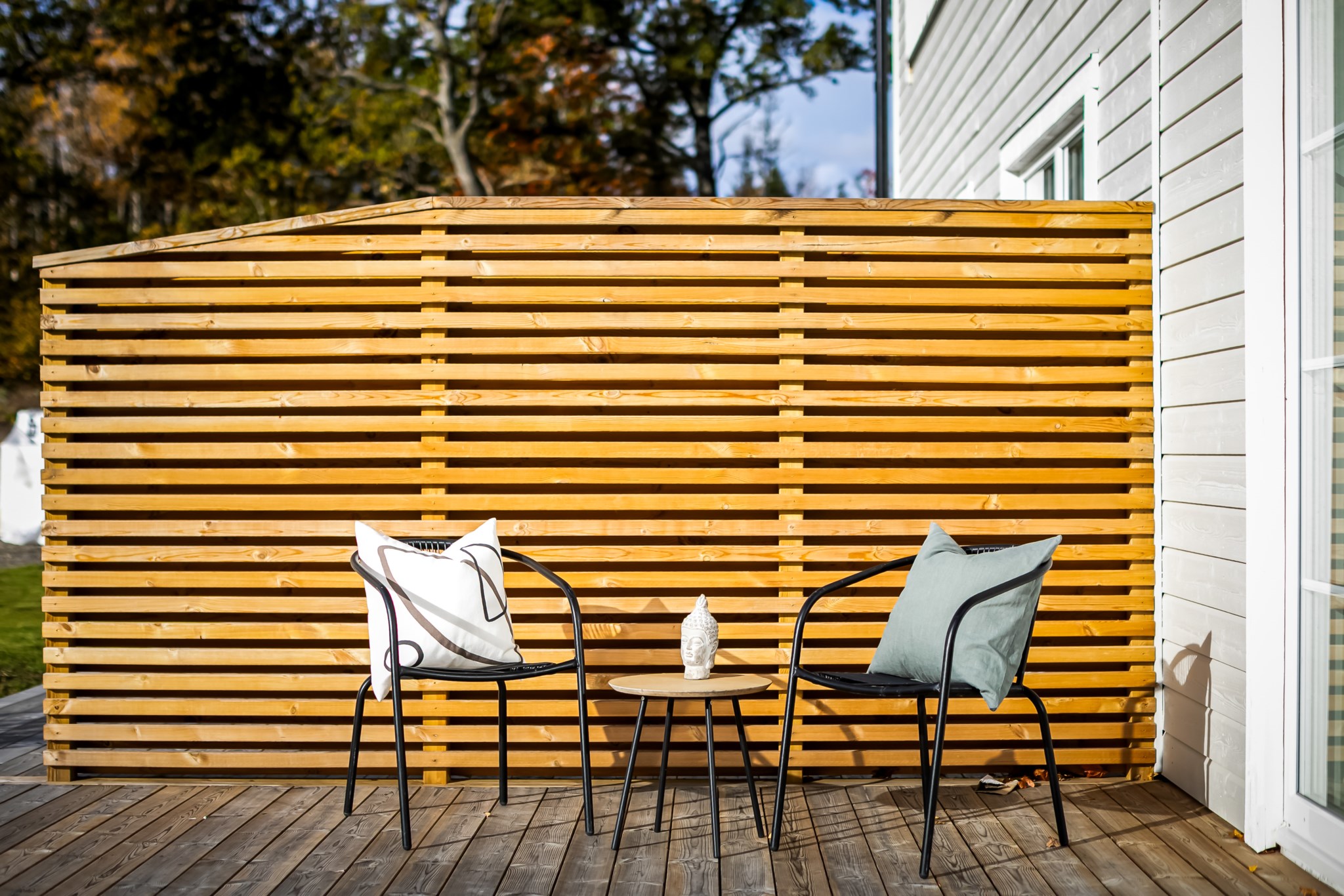 Det finns två utgångar till den trädäckade altanen som sträcker sig runt huset. Badrum med tvättstuga och ett mindre sovrum/förråd.