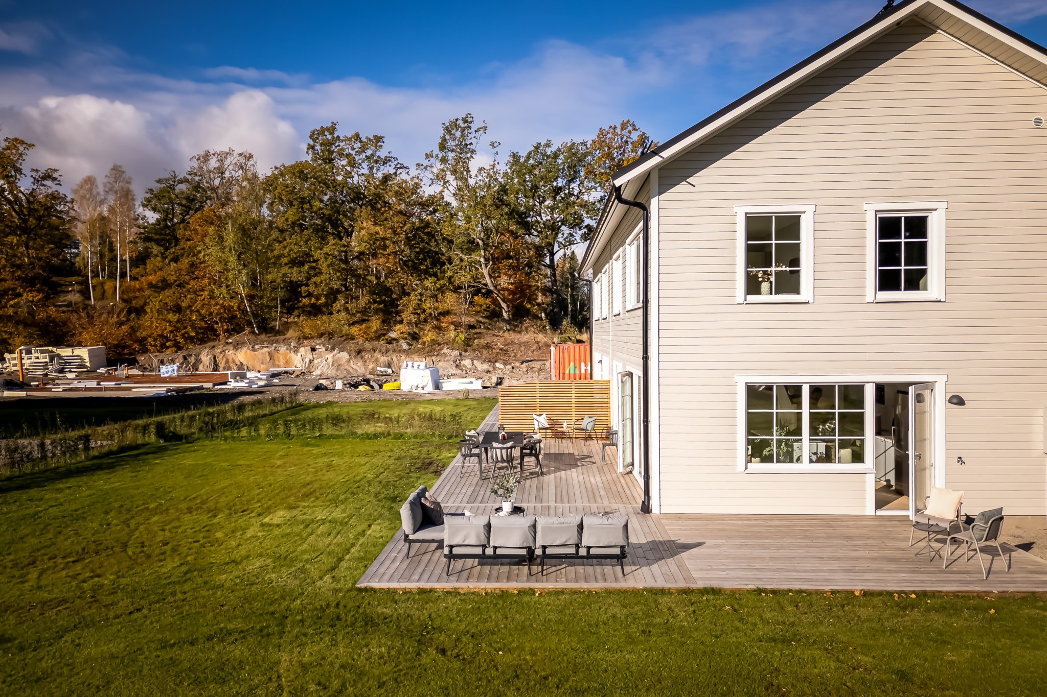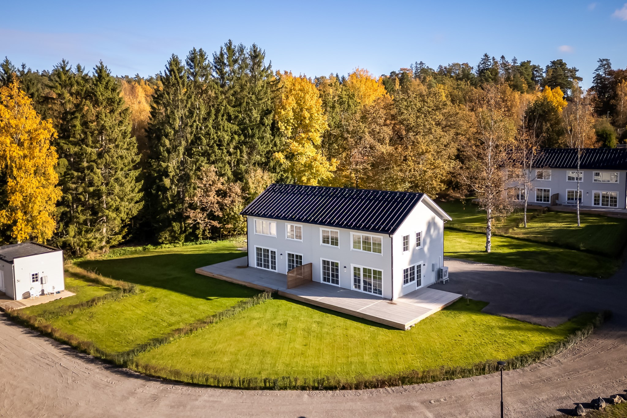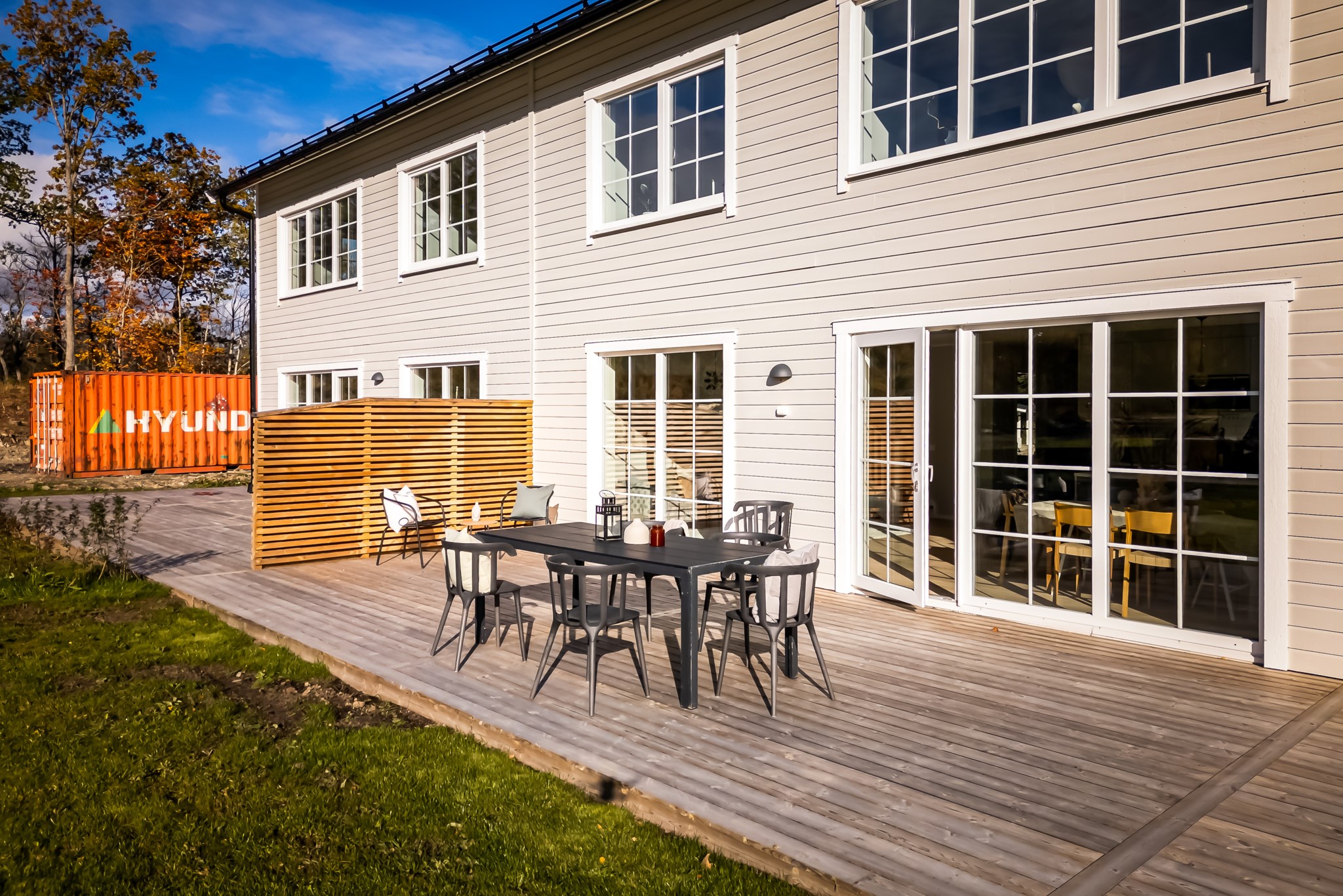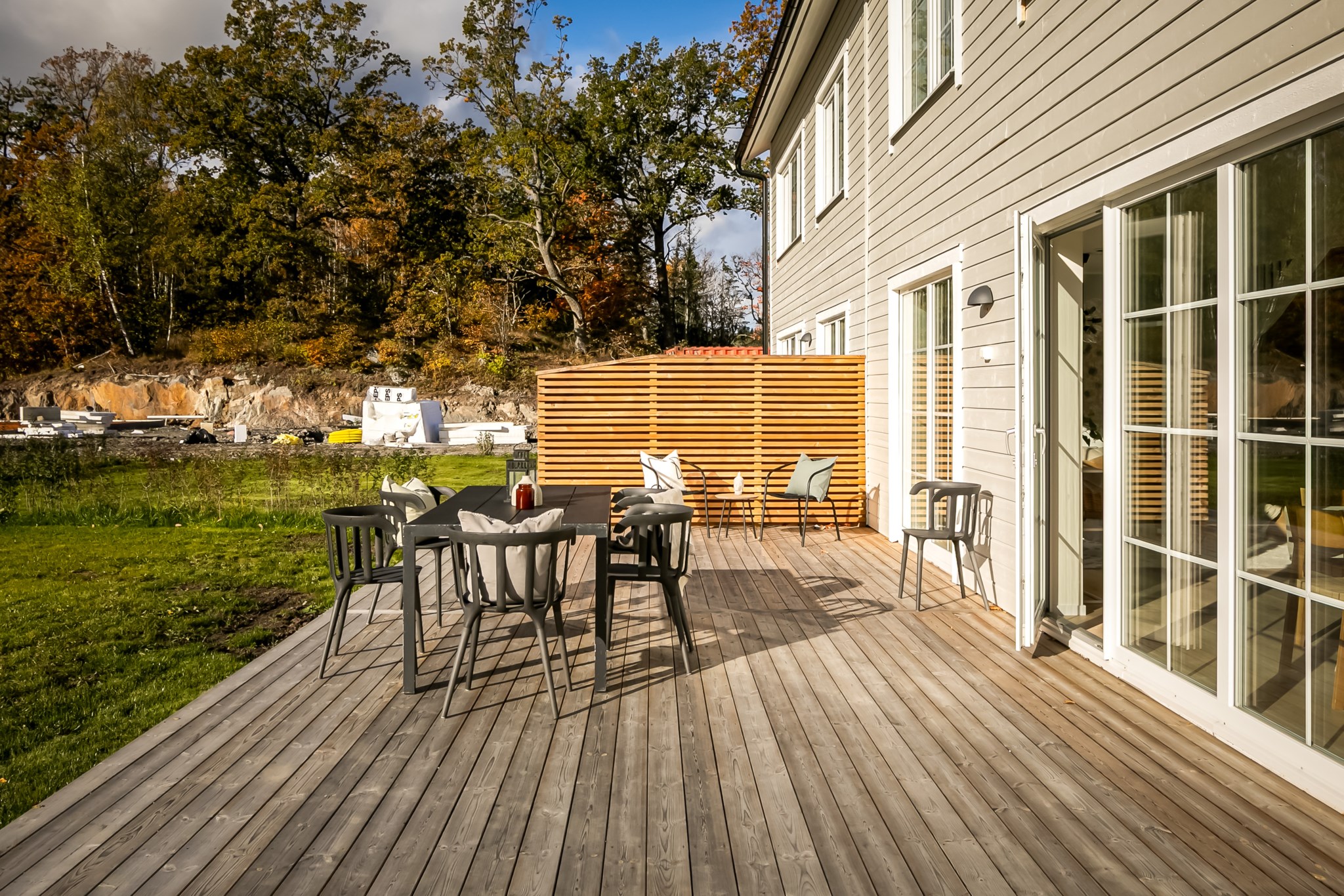 Det finns två utgångar till den trädäckade altanen som sträcker sig runt huset. Badrum med tvättstuga och ett mindre sovrum/förråd.