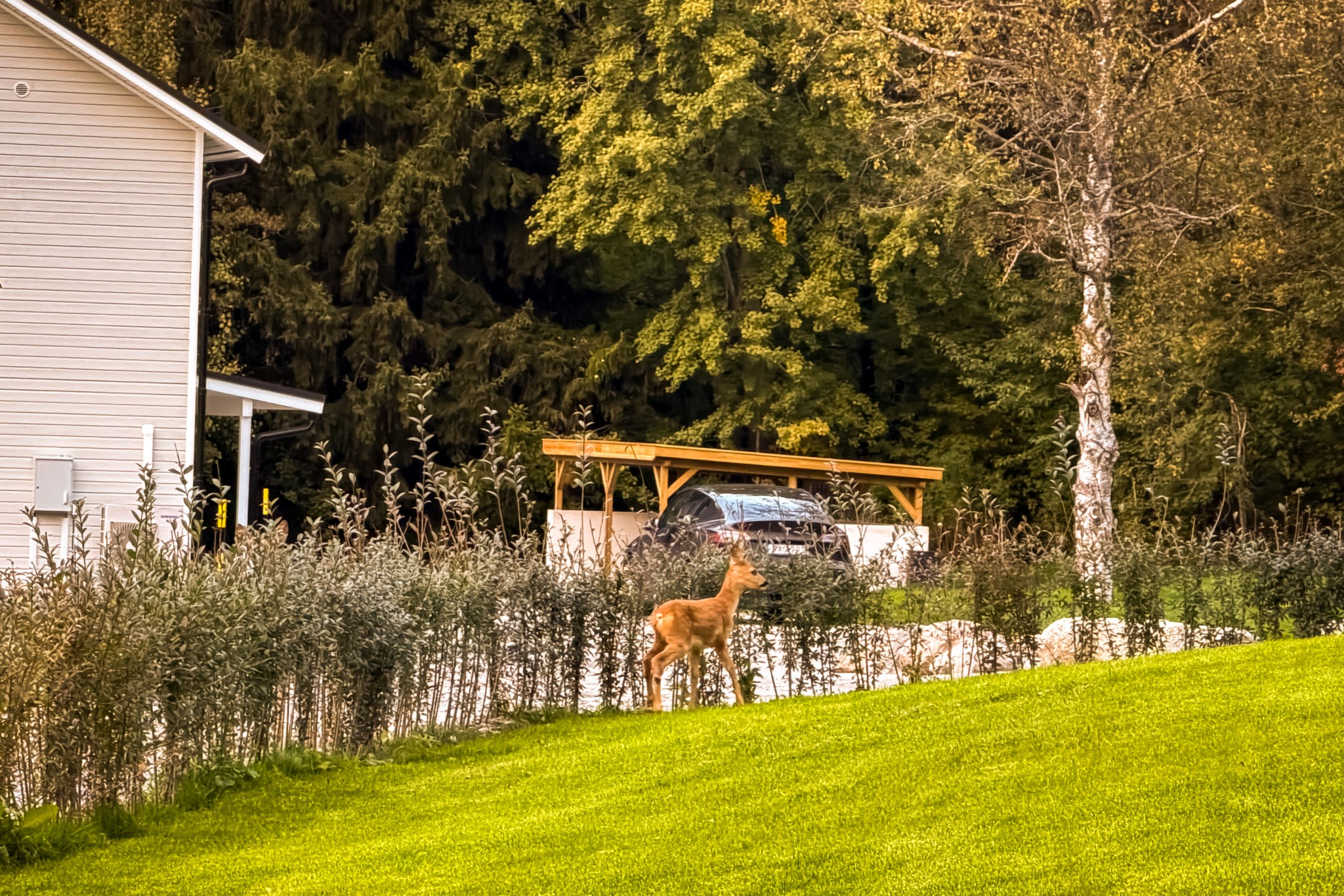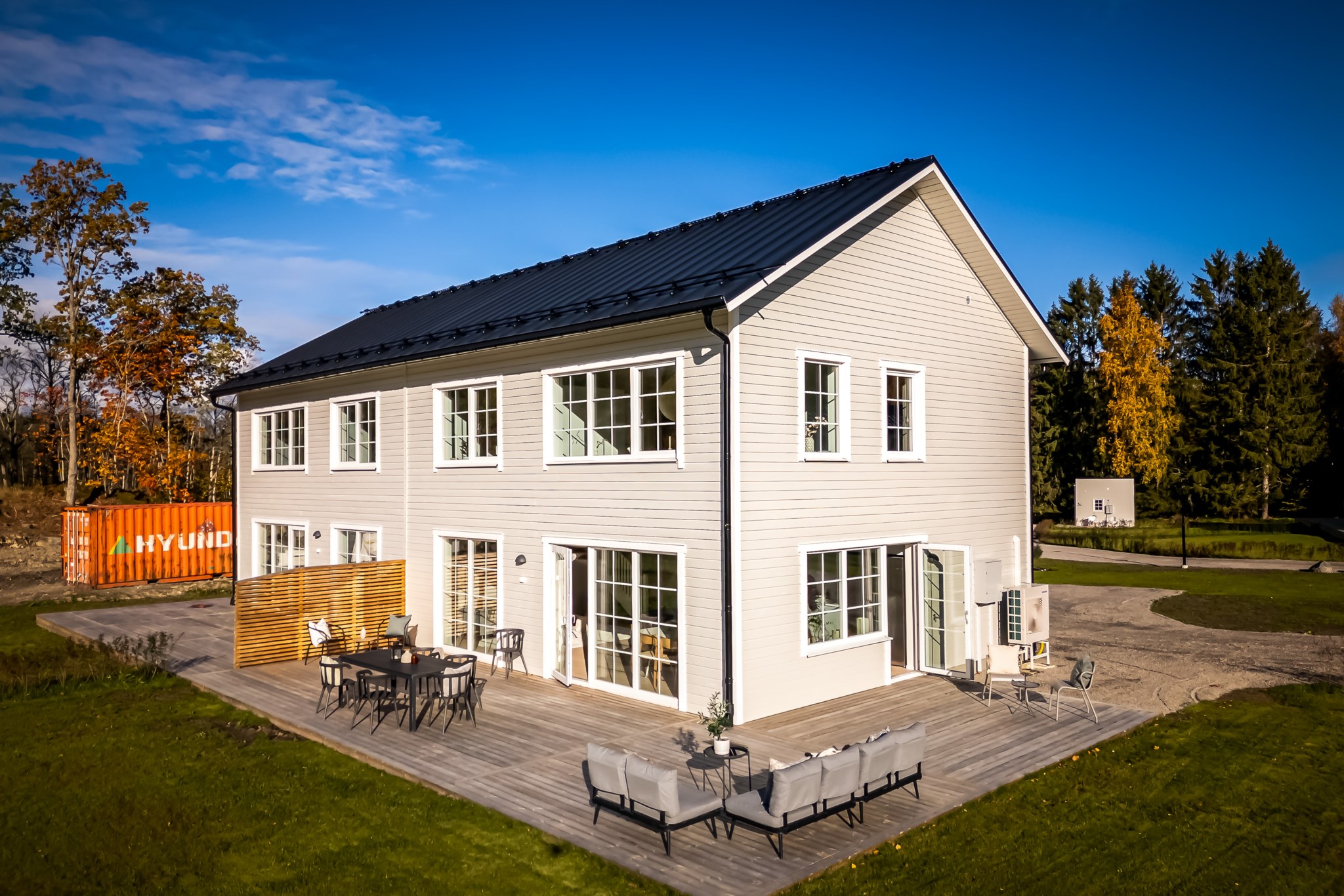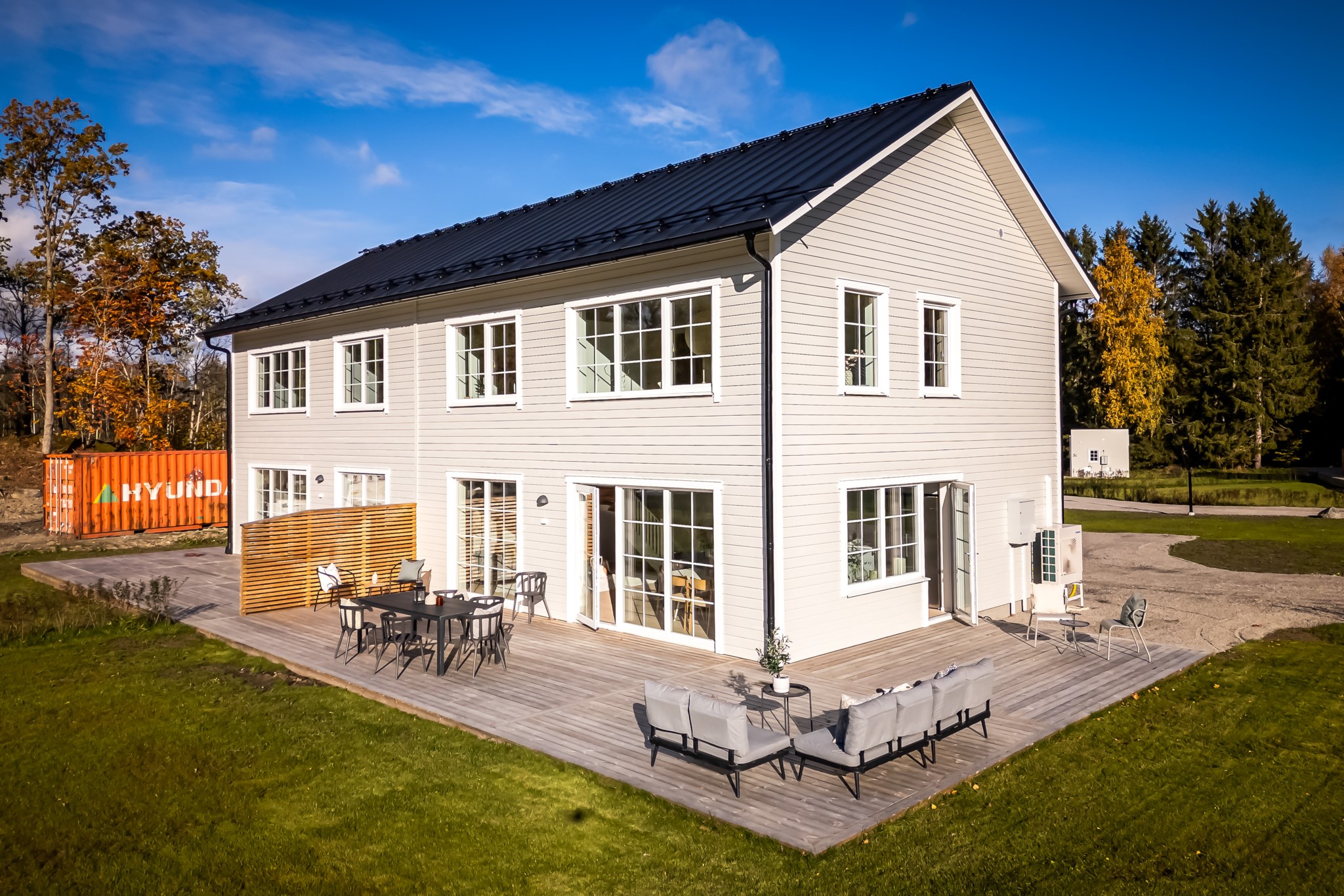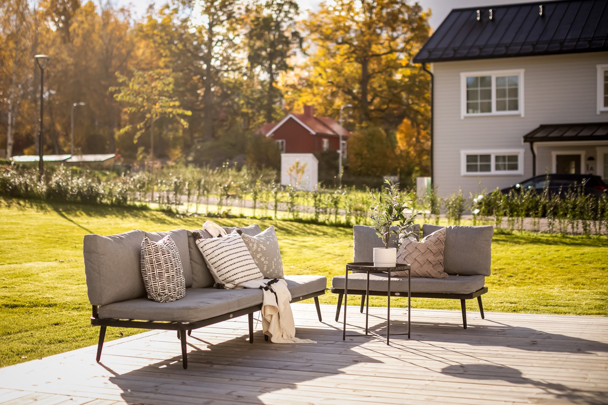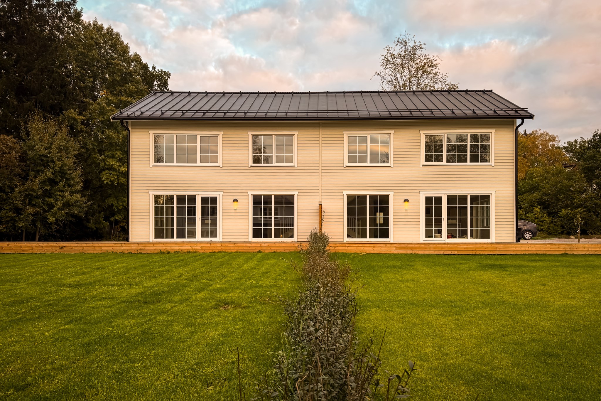 Det finns två utgångar till den trädäckade altanen som sträcker sig runt huset. Badrum med tvättstuga och ett mindre sovrum/förråd.